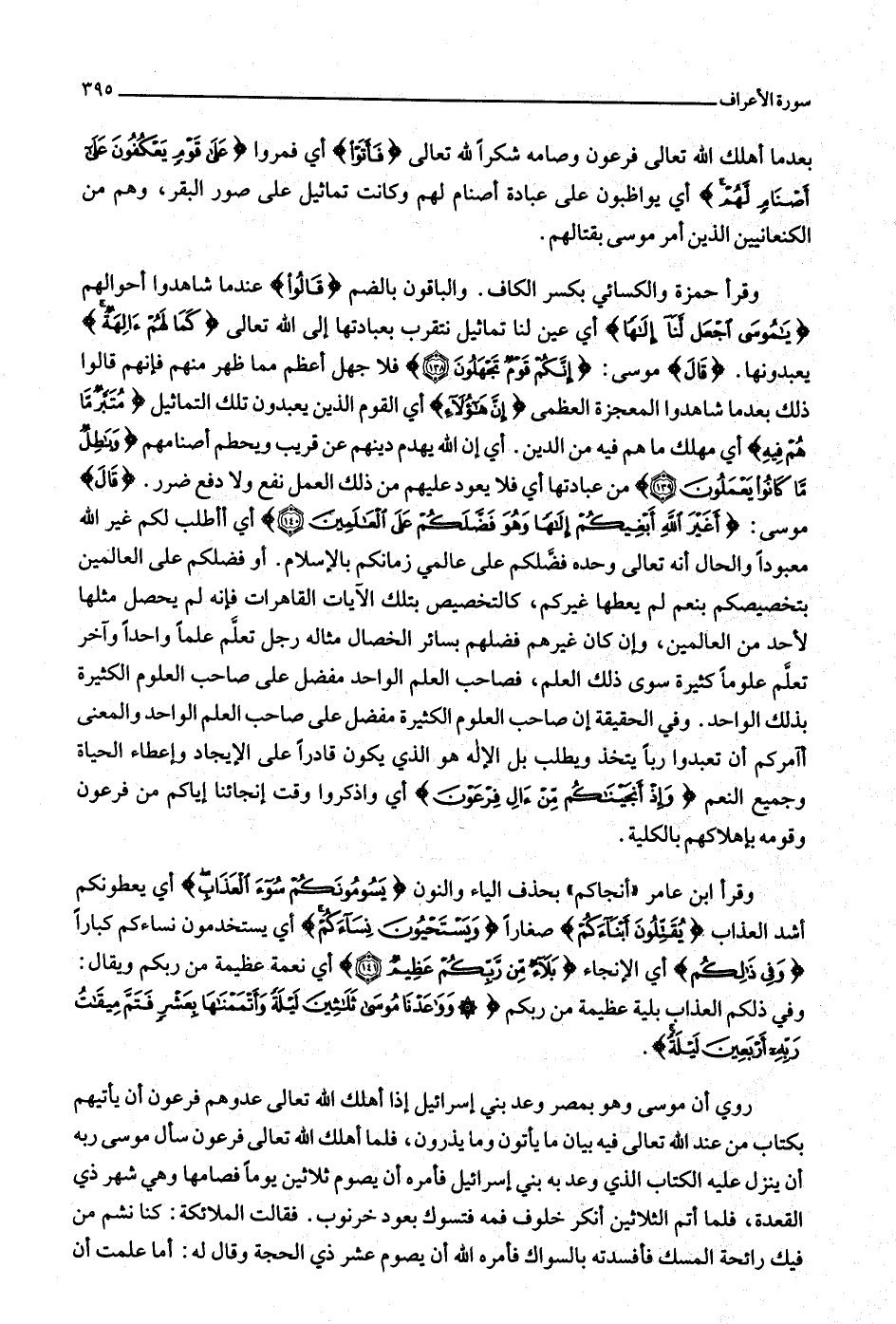 وقرأ حمزة والكسائي بكسر الكاف. والباقون بالضم قالُوا عند ما شاهدوا أحوالهم يا مُوسَى اجْعَلْ لَنا إِلهاً أي عين لنا تماثيل نتقرب بعبادتها إلى الله تعالى كَما لَهُمْ آلِهَةٌ يعبدونها. قالَ موسى: إِنَّكُمْ قَوْمٌ تَجْهَلُونَ (138) فلا جهل أعظم مما ظهر منهم فإنهم قالوا ذلك بعد ما شاهدوا المعجزة العظمى إِنَّ هؤُلاءِ أي القوم الذين يعبدون تلك التماثيل مُتَبَّرٌ ما هُمْ فِيهِ أي مهلك ما هم فيه من الدين. أي إن الله يهدم دينهم عن قريب ويحطم أصنامهم وَبَطَلَ ما كانُوا يَعْمَلُونَ (139) من عبادتها أي فلا يعود عليهم من ذلك العمل نفع ولا دفع ضرر. قالَ موسى: أَغَيْرَ اللَّهِ أَبْغِيكُمْ إِلهاً وَهُوَ فَضَّلَكُمْ عَلَى الْعالَمِينَ (140) أي أأطلب لكم غير الله معبودا والحال أنه تعالى وحده فضّلكم على عالمي زمانكم بالإسلام. أو فضلكم على العالمين بتخصيصكم بنعم لم يعطها غيركم، كالتخصيص بتلك الآيات القاهرات فإنه لم يحصل مثلها لأحد من العالمين، وإن كان غيرهم فضلهم بسائر الخصال مثاله رجل تعلّم علما واحدا وآخر تعلّم علوما كثيرة سوى ذلك العلم، فصاحب العلم الواحد مفضل على صاحب العلوم الكثيرة بذلك الواحد. وفي الحقيقة إن صاحب العلوم الكثيرة مفضل على صاحب العلم الواحد والمعنى أآمركم أن تعبدوا ربا يتخذ ويطلب بل الإله هو الذي يكون قادرا على الإيجاد وإعطاء الحياة وجميع النعم