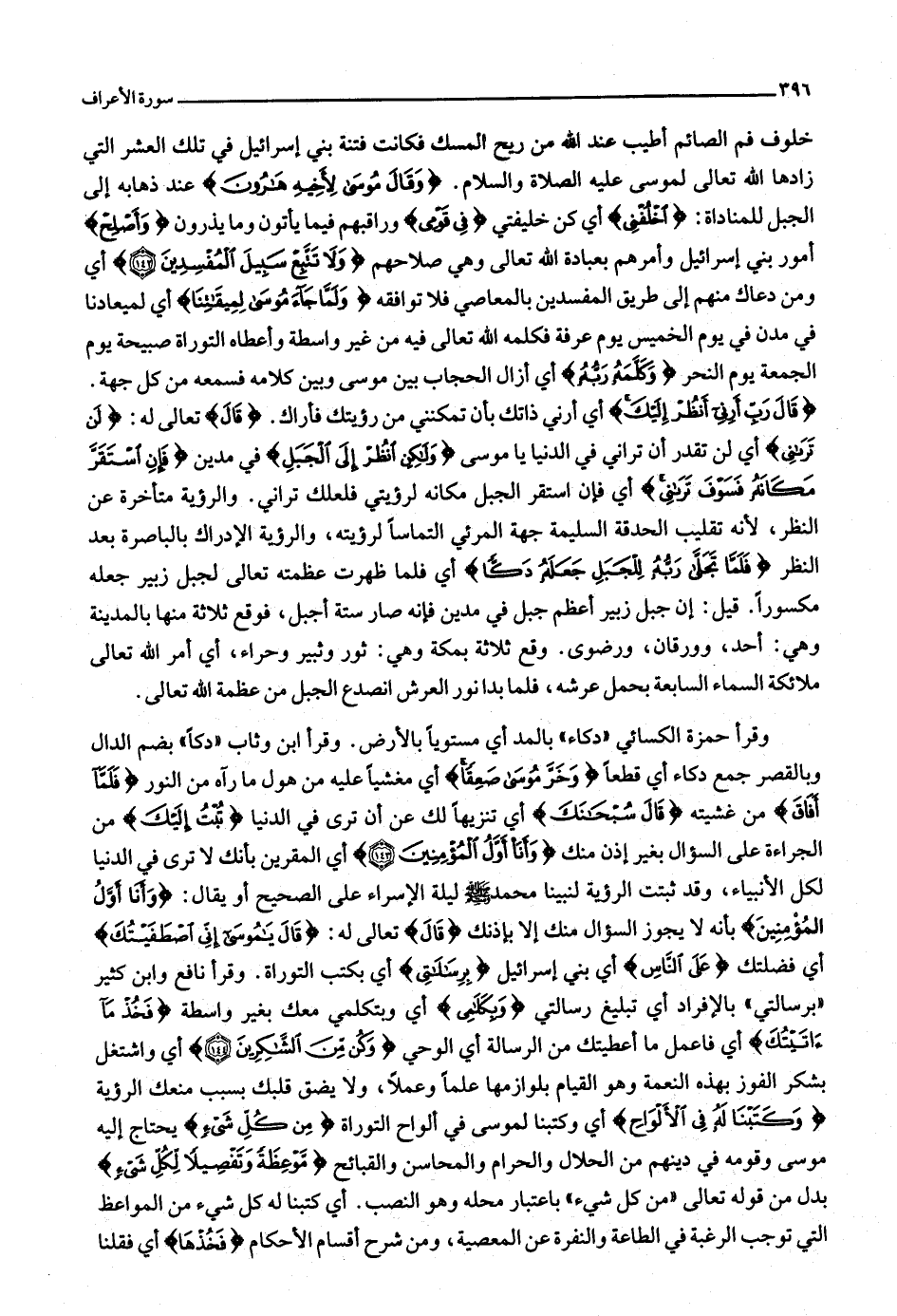 قالَ رَبِّ أَرِنِي أَنْظُرْ إِلَيْكَ أي أرني ذاتك بأن تمكنني من رؤيتك فأراك. قالَ تعالى له: لَنْ تَرانِي أي لن تقدر أن تراني في الدنيا يا موسى وَلكِنِ انْظُرْ إِلَى الْجَبَلِ في مدين فَإِنِ اسْتَقَرَّ مَكانَهُ فَسَوْفَ تَرانِي أي فإن استقر الجبل مكانه لرؤيتي فلعلك تراني. والرؤية متأخرة عن النظر، لأنه تقليب الحدقة السليمة جهة المرئي التماسا لرؤيته، والرؤية الإدراك بالباصرة بعد النظر فَلَمَّا تَجَلَّى رَبُّهُ لِلْجَبَلِ جَعَلَهُ دَكًّا أي فلما ظهرت عظمته تعالى لجبل زبير جعله مكسورا. قيل: إن جبل زبير أعظم جبل في مدين فإنه صار ستة أجبل، فوقع ثلاثة منها بالمدينة وهي: أحد، وورقان، ورضوى. وقع ثلاثة بمكة وهي: ثور وثبير وحراء، أي أمر الله تعالى ملائكة السماء السابعة بحمل عرشه، فلما بدا نور العرش انصدع الجبل من عظمة الله تعالى.