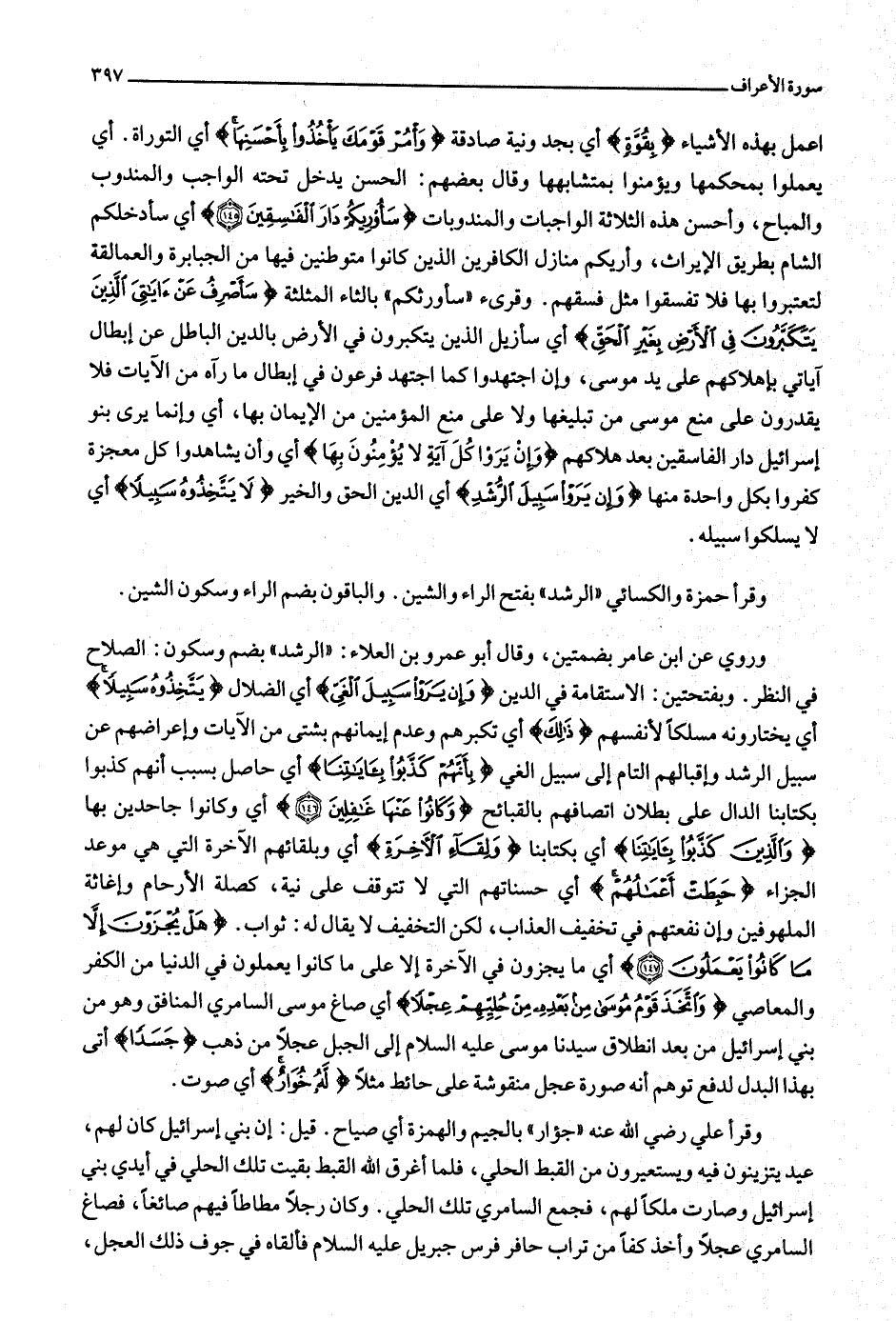وروي عن ابن عامر بضمتين، وقال أبو عمرو بن العلاء: «الرشد» بضم وسكون: الصلاح في النظر. وبفتحتين: الاستقامة في الدين وَإِنْ يَرَوْا سَبِيلَ الغَيِّ أي الضلال يَتَّخِذُوهُ سَبِيلًا أي يختارونه مسلكا لأنفسهم ذلِكَ أي تكبرهم وعدم إيمانهم بشتى من الآيات وإعراضهم عن سبيل الرشد وإقبالهم التام إلى سبيل الغي بِأَنَّهُمْ كَذَّبُوا بِآياتِنا أي حاصل بسبب أنهم كذبوا بكتابنا الدال على بطلان اتصافهم بالقبائح وَكانُوا عَنْها غافِلِينَ (146) أي وكانوا جاحدين بها وَالَّذِينَ كَذَّبُوا بِآياتِنا أي بكتابنا وَلِقاءِ الْآخِرَةِ أي وبلقائهم الآخرة التي هي موعد الجزاء حَبِطَتْ أَعْمالُهُمْ أي حسناتهم التي لا تتوقف على نية، كصلة الأرحام وإغاثة الملهوفين وإن نفعتهم في تخفيف العذاب، لكن التخفيف لا يقال له: ثواب. هَلْ يُجْزَوْنَ إِلَّا ما كانُوا يَعْمَلُونَ (147) أي ما يجزون في الآخرة إلا على ما كانوا يعملون في الدنيا من الكفر والمعاصي وَاتَّخَذَ قَوْمُ مُوسى مِنْ بَعْدِهِ مِنْ حُلِيِّهِمْ عِجْلًا أي صاغ موسى السامري المنافق وهو من بني إسرائيل من بعد انطلاق سيدنا موسى عليه السلام إلى الجبل عجلا من ذهب جَسَداً أتى بهذا البدل لدفع توهم أنه صورة عجل منقوشة على حائط مثلا لَهُ خُوارٌ أي صوت.