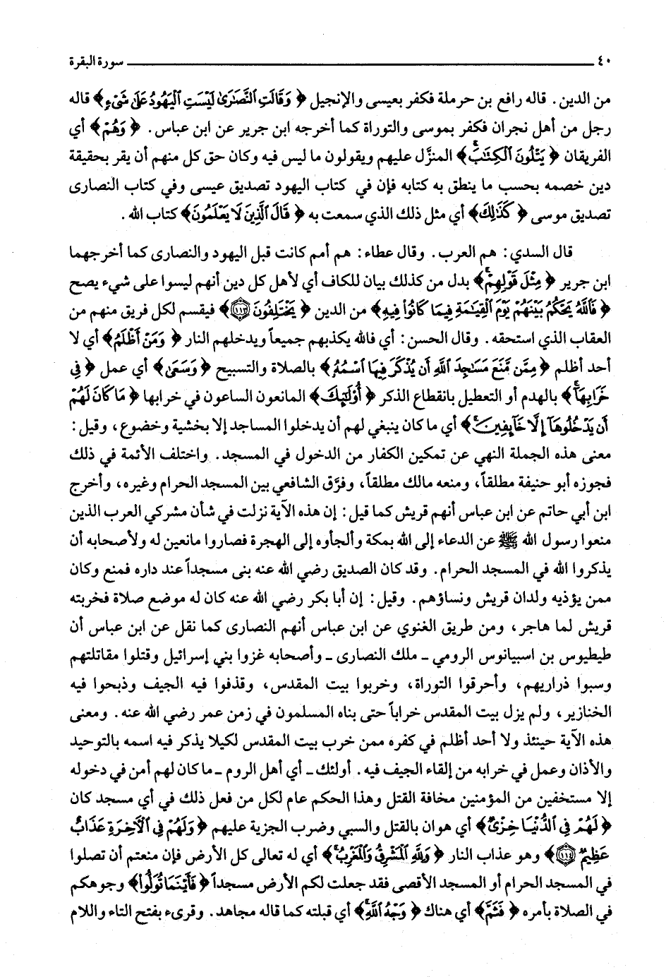 قال السدي: هم العرب. وقال عطاء: هم أمم كانت قبل اليهود والنصارى كما أخرجهما ابن جرير مِثْلَ قَوْلِهِمْ بدل من كذلك بيان للكاف أي لأهل كل دين أنهم ليسوا على شيء يصح فَاللَّهُ يَحْكُمُ بَيْنَهُمْ يَوْمَ الْقِيامَةِ فِيما كانُوا فِيهِ من الدين يَخْتَلِفُونَ (113) فيقسم لكل فريق منهم من العقاب الذي استحقه. وقال الحسن: أي فالله يكذبهم جميعا ويدخلهم النار وَمَنْ أَظْلَمُ أي لا أحد أظلم مِمَّنْ مَنَعَ مَساجِدَ اللَّهِ أَنْ يُذْكَرَ فِيهَا اسْمُهُ بالصلاة والتسبيح وَسَعى أي عمل فِي خَرابِها بالهدم أو التعطيل بانقطاع الذكر أُولئِكَ المانعون الساعون في خرابها ما كانَ لَهُمْ أَنْ يَدْخُلُوها إِلَّا خائِفِينَ أي ما كان ينبغي لهم أن يدخلوا المساجد إلا بخشية وخضوع، وقيل: