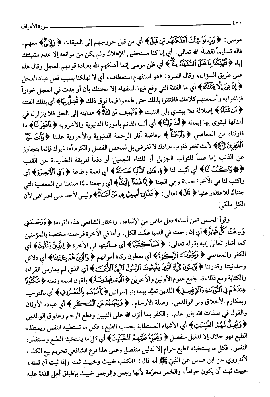 قاله تسليما لقضاء الله تعالى. أي إنا كنا مستحقين للإهلاك ولم يكن من موانعه إلا عدم مشيئتك إياه أَتُهْلِكُنا بِما فَعَلَ السُّفَهاءُ مِنَّا أي ظن موسى إنما أهلكهم الله بعبادة قومهم العجل وقال هذا على طريق السؤال، وقال المبرد: «هو استفهام استعطاف، أي لا تهلكنا بسبب فعل عباد العجل إِنْ هِيَ إِلَّا فِتْنَتُكَ أي ما الفتنة التي وقع فيها السفهاء إلا محنتك بأن أوجدت في العجل خوارا فزاغوا به وأسمعتهم كلامك فافتتنوا بذلك حتى طمعوا فيما فوق ذلك تُضِلُّ بِها أي بتلك الفتنة مَنْ تَشاءُ إضلالة فلا يهتدي إلى التثبت وَتَهْدِي مَنْ تَشاءُ هدايته إلى الحق فلا يتزلزل في أمثالها فيقوى بها إيمانه أَنْتَ وَلِيُّنا أي أنت القائم بأمورنا الدنيوية والأخروية فَاغْفِرْ لَنا ما قارفناه من المعاصي وَارْحَمْنا بإفاضة آثار الرحمة الدنيوية والأخروية علينا وَأَنْتَ خَيْرُ الْغافِرِينَ (155) لأنك تغفر ذنوب عبادك لا لغرض بل لمحض الفضل والكرم أما غيرك فإنما يتجاوز عن الذنب إما طلبا للثواب الجزيل أو للثناء الجميل أو دفعا للربقة الخسيسة عن القلب وَاكْتُبْ لَنا أي أثبت لنا فِي هذِهِ الدُّنْيا حَسَنَةً أي نعمة وطاعة وَفِي الْآخِرَةِ أي واكتب لنا في الآخرة حسنة وهي الجنة إِنَّا هُدْنا إِلَيْكَ أي رجعنا عمّا صنعنا من المعصية التي جئناك للاعتذار عنها قالَ تعالى: عَذابِي أُصِيبُ بِهِ مَنْ أَشاءُ وليس لأحد على اعتراض لأن الكل ملكي.