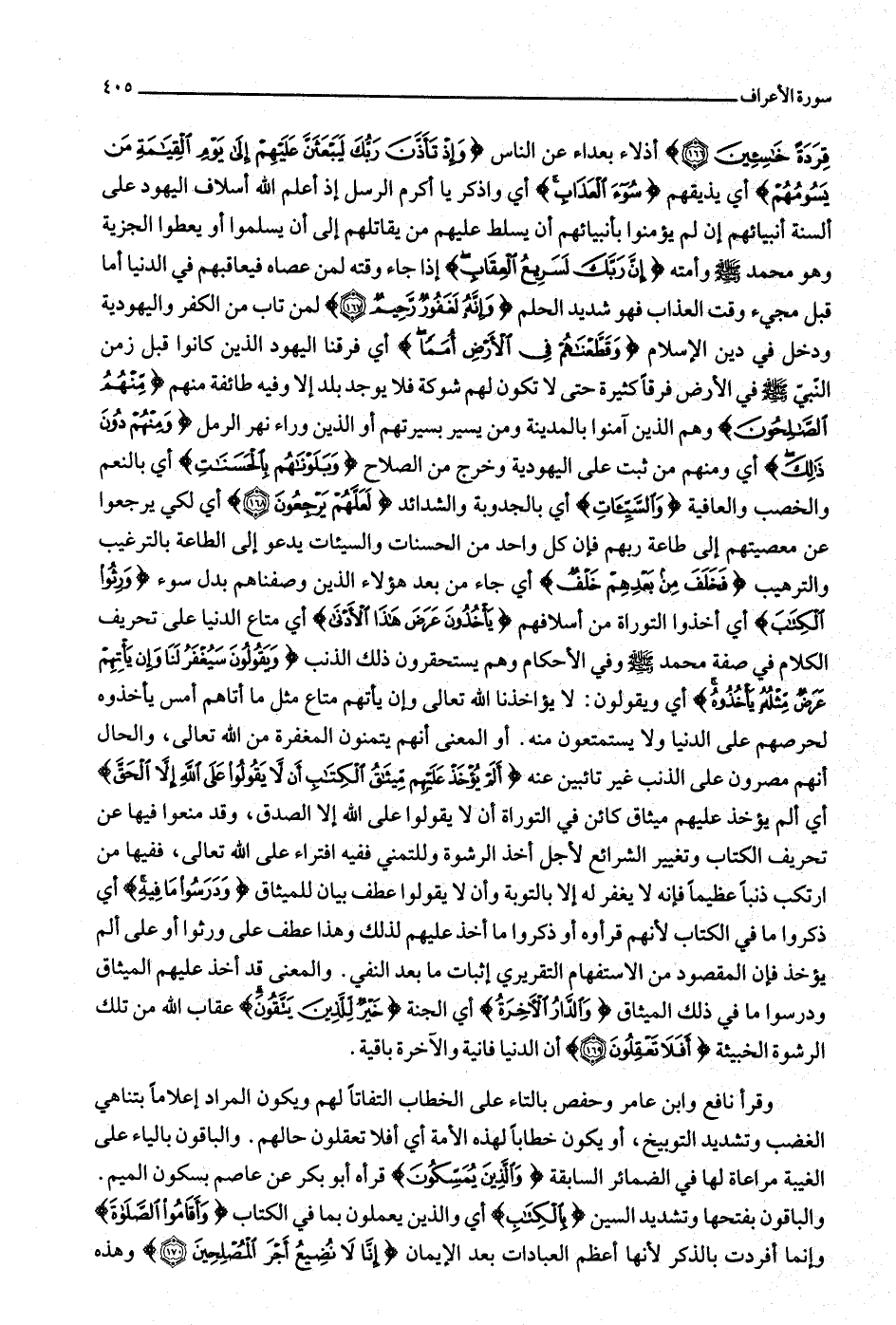 (166) أذلاء بعداء عن الناس وَإِذْ تَأَذَّنَ رَبُّكَ لَيَبْعَثَنَّ عَلَيْهِمْ إِلى يَوْمِ الْقِيامَةِ مَنْ يَسُومُهُمْ أي يذيقهم سُوءَ الْعَذابِ أي واذكر يا أكرم الرسل إذ أعلم الله أسلاف اليهود على ألسنة أنبيائهم إن لم يؤمنوا بأنبيائهم أن يسلط عليهم من يقاتلهم إلى أن يسلموا أو يعطوا الجزية وهو محمد صلّى الله عليه وسلّم وأمته إِنَّ رَبَّكَ لَسَرِيعُ الْعِقابِ إذا جاء وقته لمن عصاه فيعاقبهم في الدنيا أما قبل مجيء وقت العذاب فهو شديد الحلم وَإِنَّهُ لَغَفُورٌ رَحِيمٌ (167) لمن تاب من الكفر واليهودية ودخل في دين الإسلام وَقَطَّعْناهُمْ فِي الْأَرْضِ أُمَماً أي فرقنا اليهود الذين كانوا قبل زمن النّبيّ صلّى الله عليه وسلّم في الأرض فرقا كثيرة حتى لا تكون لهم شوكة فلا يوجد بلد إلا وفيه طائفة منهم مِنْهُمُ الصَّالِحُونَ وهم الذين آمنوا بالمدينة ومن يسير بسيرتهم أو الذين وراء نهر الرمل وَمِنْهُمْ دُونَ ذلِكَ أي ومنهم من ثبت على اليهودية وخرج من الصلاح وَبَلَوْناهُمْ بِالْحَسَناتِ أي بالنعم والخصب والعافية وَالسَّيِّئاتِ أي بالجدوبة والشدائد لَعَلَّهُمْ يَرْجِعُونَ (168) أي لكي يرجعوا عن معصيتهم إلى طاعة ربهم فإن كل واحد من الحسنات والسيئات يدعو إلى الطاعة بالترغيب والترهيب فَخَلَفَ مِنْ بَعْدِهِمْ خَلْفٌ أي جاء من بعد هؤلاء الذين وصفناهم بدل سوء وَرِثُوا الْكِتابَ أي أخذوا التوراة من أسلافهم يَأْخُذُونَ عَرَضَ هذَا الْأَدْنى أي متاع الدنيا على تحريف الكلام في صفة محمد صلّى الله عليه وسلّم وفي الأحكام وهم يستحقرون ذلك الذنب وَيَقُولُونَ سَيُغْفَرُ لَنا وَإِنْ يَأْتِهِمْ عَرَضٌ مِثْلُهُ يَأْخُذُوهُ أي ويقولون: لا يؤاخذنا الله تعالى وإن يأتهم متاع مثل ما أتاهم أمس يأخذوه لحرصهم على الدنيا ولا يستمتعون منه. أو المعنى أنهم يتمنون المغفرة من الله تعالى، والحال أنهم مصرون على الذنب غير تائبين عنه أَلَمْ يُؤْخَذْ عَلَيْهِمْ مِيثاقُ الْكِتابِ أَنْ لا يَقُولُوا عَلَى اللَّهِ إِلَّا الْحَقَّ أي ألم يؤخذ عليهم ميثاق كائن في التوراة أن لا يقولوا على الله إلا الصدق، وقد منعوا فيها عن تحريف الكتاب وتغيير الشرائع لأجل أخذ الرشوة وللتمني ففيه افتراء على الله تعالى، ففيها من ارتكب ذنبا عظيما فإنه لا يغفر له إلا بالتوبة وأن لا يقولوا عطف بيان للميثاق وَدَرَسُوا ما فِيهِ أي ذكروا ما في الكتاب لأنهم قرءوه أو ذكروا ما أخذ عليهم لذلك وهذا عطف على ورثوا أو على ألم يؤخذ فإن المقصود من الاستفهام التقريري إثبات ما بعد النفي. والمعنى قد أخذ عليهم الميثاق ودرسوا ما في ذلك الميثاق وَالدَّارُ الْآخِرَةُ أي الجنة خَيْرٌ لِلَّذِينَ يَتَّقُونَ عقاب الله من تلك الرشوة الخبيثة أَفَلا تَعْقِلُونَ (169) أن الدنيا فانية والآخرة باقية.
