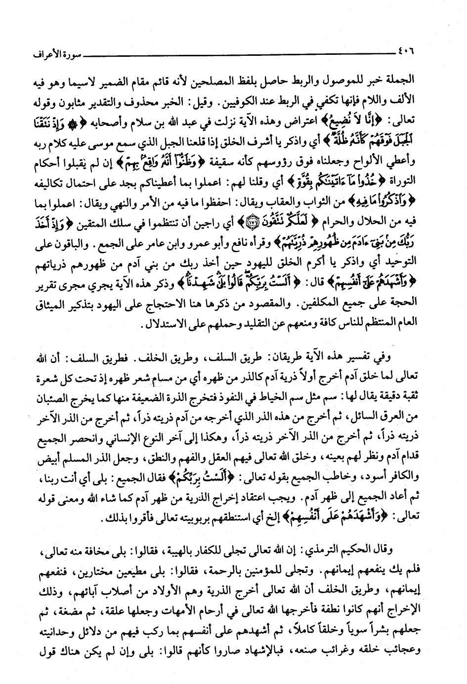 وفي تفسير هذه الآية طريقان: طريق السلف، وطريق الخلف. فطريق السلف: أن الله تعالى لما خلق آدم أخرج أولا ذرية آدم كالذر من ظهره أي من مسام شعر ظهره إذ تحت كل شعرة ثقبة دقيقة يقال لها: سم مثل سم الخياط في النفوذ فتخرج الذرة الضعيفة منها كما يخرج الصئبان من العرق السائل، ثم أخرج من هذه الذر الذي أخرجه من آدم ذريته ذرا، ثم أخرج من الذر الآخر ذريته ذرا، ثم أخرج من الذر الآخر ذريته ذرا، وهكذا إلى آخر النوع الإنساني وانحصر الجميع قدام آدم ونظر لهم بعينه، وخلق الله تعالى فيهم العقل والفهم والنطق، وجعل الذر المسلم أبيض والكافر أسود، وخاطب الجميع بقوله تعالى: أَلَسْتُ بِرَبِّكُمْ فقال الجميع: بلى أي أنت ربنا، ثم أعاد الجميع إلى ظهر آدم. ويجب اعتقاد إخراج الذرية من ظهر آدم كما شاء الله ومعنى قوله تعالى: وَأَشْهَدَهُمْ عَلى أَنْفُسِهِمْ إلخ أي استنطقهم بربوبيته تعالى فأقروا بذلك.