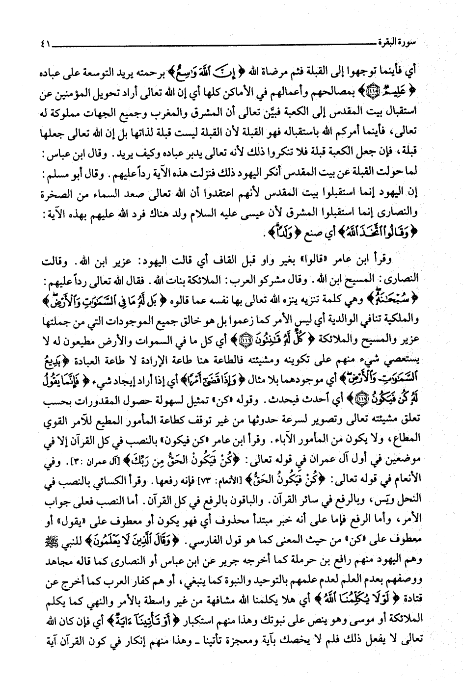 سُبْحانَهُ وهي كلمة تنزيه ينزه الله تعالى بها نفسه عما قالوه بَلْ لَهُ ما فِي السَّماواتِ وَالْأَرْضِ والملكية تنافي الوالدية أي ليس الأمر كما زعموا بل هو خالق جميع الموجودات التي من جملتها عزير والمسيح والملائكة كُلٌّ لَهُ قانِتُونَ (116) أي كل ما في السموات والأرض مطيعون له لا يستعصي شيء منهم على تكوينه ومشيئته فالطاعة هنا طاعة الإرادة لا طاعة العبادة بَدِيعُ السَّماواتِ وَالْأَرْضِ أي موجودهما بلا مثال وَإِذا قَضى أَمْراً أي إذا أراد إيجاد شيء فَإِنَّما يَقُولُ لَهُ كُنْ فَيَكُونُ (117) أي أحدث فيحدث. وقوله «كن» تمثيل لسهولة حصول المقدورات بحسب تعلق مشيئته تعالى وتصوير لسرعة حدوثها من غير توقف كطاعة المأمور المطيع للآمر القوي المطاع، ولا يكون من المأمور الآباء. وقرأ ابن عامر «كن فيكون» بالنصب في كل القرآن إلا في موضعين في أول آل عمران في قوله تعالى: كُنْ فَيَكُونُ الْحَقُّ مِنْ رَبِّكَ [آل عمران: 3] . وفي الأنعام في قوله تعالى: كُنْ فَيَكُونُ الْحَقُّ [الأنعام: 73] فإنه رفعها. وقرأ الكسائي بالنصب في النحل ويس، وبالرفع في سائر القرآن. والباقون بالرفع في كل القرآن. أما النصب فعلى جواب الأمر، وأما الرفع فإما على أنه خبر مبتدأ محذوف أي فهو يكون أو معطوف على «يقول» أو معطوف على «كن» من حيث المعنى كما هو قول الفارسي. وَقالَ الَّذِينَ لا يَعْلَمُونَ للنبي صلّى الله عليه وسلّم وهم اليهود منهم رافع بن حرملة كما أخرجه جرير عن ابن عباس أو النصارى كما قاله مجاهد ووصفهم بعدم العلم لعدم علمهم بالتوحيد والنبوة كما ينبغي، أو هم كفار العرب كما أخرج عن قتادة لَوْلا يُكَلِّمُنَا اللَّهُ أي هلا يكلمنا الله مشافهة من غير واسطة بالأمر والنهي كما يكلم الملائكة أو موسى وهو ينص على نبوتك وهذا منهم استكبار أَوْ تَأْتِينا آيَةٌ أي فإن كان الله تعالى لا يفعل ذلك فلم لا يخصك بآية ومعجزة تأتينا- وهذا منهم إنكار في كون القرآن آية