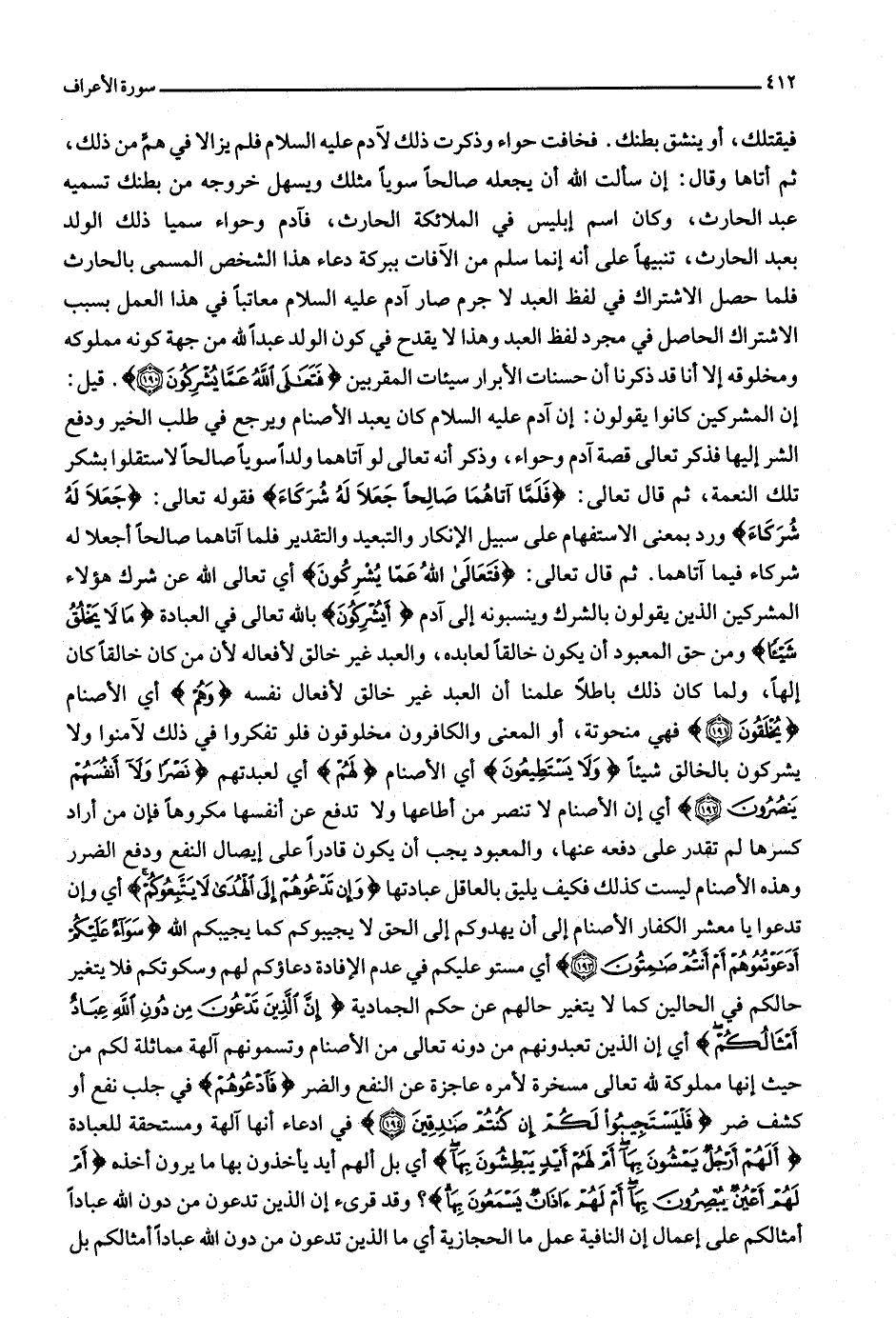 ثم قال تعالى: فَلَمَّا آتاهُما صالِحاً جَعَلا لَهُ شُرَكاءَ فقوله تعالى: جَعَلا لَهُ شُرَكاءَ ورد بمعنى الاستفهام على سبيل الإنكار والتبعيد والتقدير فلما آتاهما صالحا أجعلا له شركاء فيما آتاهما. ثم قال تعالى: فَتَعالَى اللَّهُ عَمَّا يُشْرِكُونَ أي تعالى الله عن شرك هؤلاء المشركين الذين يقولون بالشرك وينسبونه إلى آدم أَيُشْرِكُونَ بالله تعالى في العبادة ما لا يَخْلُقُ شَيْئاً ومن حق المعبود أن يكون خالقا لعابده، والعبد غير خالق لأفعاله لأن من كان خالقا كان إلها، ولما كان ذلك باطلا علمنا أن العبد غير خالق لأفعال نفسه وَهُمْ أي الأصنام يُخْلَقُونَ (191) فهي منحوتة، أو المعنى والكافرون مخلوقون فلو تفكروا في ذلك لآمنوا ولا يشركون بالخالق شيئا وَلا يَسْتَطِيعُونَ أي الأصنام لَهُمْ أي لعبدتهم نَصْراً وَلا أَنْفُسَهُمْ يَنْصُرُونَ (192) أي إن الأصنام لا تنصر من أطاعها ولا تدفع عن أنفسها مكروها فإن من أراد كسرها لم تقدر على دفعه عنها، والمعبود يجب أن يكون قادرا على إيصال النفع ودفع الضرر وهذه الأصنام ليست كذلك فكيف يليق بالعاقل عبادتها وَإِنْ تَدْعُوهُمْ إِلَى الْهُدى لا يَتَّبِعُوكُمْ أي وإن تدعوا يا معشر الكفار الأصنام إلى أن يهدوكم إلى الحق لا يجيبوكم كما يجيبكم الله سَواءٌ عَلَيْكُمْ أَدَعَوْتُمُوهُمْ أَمْ أَنْتُمْ صامِتُونَ (193) أي مستو عليكم في عدم الإفادة دعاؤكم لهم وسكوتكم فلا يتغير حالكم في الحالين كما لا يتغير حالهم عن حكم الجمادية إِنَّ الَّذِينَ تَدْعُونَ مِنْ دُونِ اللَّهِ عِبادٌ أَمْثالُكُمْ أي إن الذين تعبدونهم من دونه تعالى من الأصنام وتسمونهم آلهة مماثلة لكم من حيث إنها مملوكة لله تعالى مسخرة لأمره عاجزة عن النفع والضر فَادْعُوهُمْ في جلب نفع أو كشف ضر فَلْيَسْتَجِيبُوا لَكُمْ إِنْ كُنْتُمْ صادِقِينَ (194) في ادعاء أنها آلهة ومستحقة للعبادة أَلَهُمْ أَرْجُلٌ يَمْشُونَ بِها أَمْ لَهُمْ أَيْدٍ يَبْطِشُونَ بِها أي بل ألهم أيد يأخذون بها ما يرون أخذه أَمْ لَهُمْ أَعْيُنٌ يُبْصِرُونَ بِها أَمْ لَهُمْ آذانٌ يَسْمَعُونَ بِها؟ وقد قرئ إن الذين تدعون من دون الله عبادا أمثالكم على إعمال إن النافية عمل ما الحجازية أي ما الذين تدعون من دون الله عبادا أمثالكم بل