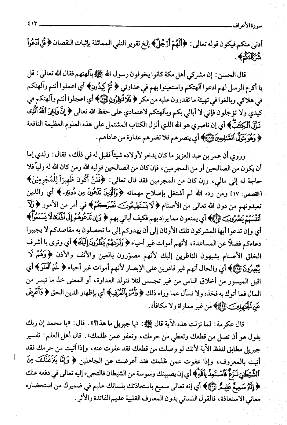 . قال أهل العلم: تفسير جبريل مطابق للفظ الآية لأنك لو وصلت من قطعك فقد عفوت عنه، وإذا آتيت من حرمك فقد أتيت بالمعروف، وإذا عفوت عمن ظلمك فقد أعرضت عن الجاهلين وَإِمَّا يَنْزَغَنَّكَ مِنَ الشَّيْطانِ نَزْغٌ فَاسْتَعِذْ بِاللَّهِ أي إن يصيبنك وسوسة من الشيطان فالتجئ إليه تعالى في دفعه عنك إِنَّهُ سَمِيعٌ عَلِيمٌ (200) أي إنه تعالى سميع باستعاذتك بلسانك عليم في ضميرك من استحضاره معاني الاستعاذة، فالقول اللساني بدون المعارف القلبية عديم الفائدة والأثر.