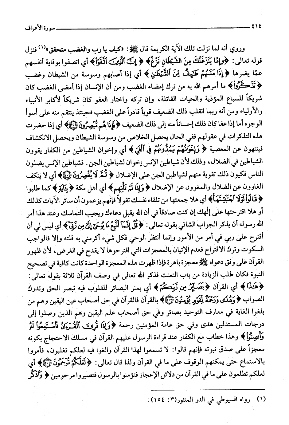 : وَإِمَّا يَنْزَغَنَّكَ مِنَ الشَّيْطانِ نَزْغٌ إِنَّ الَّذِينَ اتَّقَوْا أي اتصفوا بوقاية أنفسهم عمّا يضرها إِذا مَسَّهُمْ طائِفٌ مِنَ الشَّيْطانِ أي إذا أصابهم وسوسة من الشيطان وغضب تَذَكَّرُوا ما أمرهم الله به من ترك إمضاء الغضب ومن أن الإنسان إذا أمضى الغضب كان شريكا للسباع المؤذية والحيات القاتلة، وإن تركه واختار العفو كان شريكا لأكابر الأنبياء والأولياء ومن أنه ربما انقلب ذلك الضعيف قويا قادرا على الغضب فحينئذ ينتقم منه على أسوأ الوجوه أما إذا عفا كان ذلك إحسانا منه إلى ذلك الضعيف فَإِذا هُمْ مُبْصِرُونَ (201) أي إذا حضرت هذه التذكرات في عقولهم ففي الحال يحصل الخلاص من وسوسة الشيطان ويحصل الانكشاف فينتهون عن المعصية وَإِخْوانُهُمْ يَمُدُّونَهُمْ فِي الغَيِّ أي وإخوان الشياطين من الكفار يقوون الشياطين في الضلال، وذلك لأن شياطين الإنس إخوان لشياطين الجن. فشياطين الإنس يضلون الناس فيكون ذلك تقوية منهم لشياطين الجن على الإضلال ثُمَّ لا يُقْصِرُونَ (202) أي لا ينكف الغاوون عن الضلال والمغوون عن الإضلال وَإِذا لَمْ تَأْتِهِمْ أي أهل مكة بِآيَةٍ كما طلبوا قالُوا لَوْلا اجْتَبَيْتَها أي هلا جمعتها من تلقاء نفسك تقولا فإنهم يزعمون أن سائر الآيات كذلك أو هلا اقترحتها على إلهك إن كنت صادقا في أن الله يقبل دعاءك ويجيب التماسك وعند هذا أمر الله رسوله أن يذكر الجواب الشافي بقوله تعالى: قُلْ إِنَّما أَتَّبِعُ ما يُوحى إِلَيَّ مِنْ رَبِّي أي ليس لي أن أقترح على ربي في أمر من الأمور وإنما أنتظر الوحي فكل شيء أكرمني به قلته وإلا فالواجب السكوت وترك الاقتراح فعدم الإتيان بالمعجزات التي اقترحوها لا يقدح في الغرض، لأن ظهور القرآن على وفق دعواه صلّى الله عليه وسلّم معجزة باهرة فإذا ظهرت هذه المعجزة الواحدة كانت كافية في تصحيح النبوة فكان طلب الزيادة من باب التعنت فذكر الله تعالى في وصف القرآن ثلاثة بقوله تعالى: