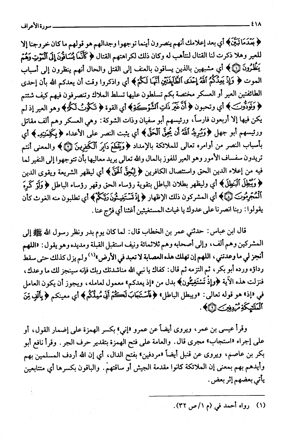 إِذْ تَسْتَغِيثُونَ بدل من «إذ يعدكم» معمول لعامله، ويجوز أن يكون العامل في «إذ» هو قوله تعالى: «ويبطل الباطل» فَاسْتَجابَ لَكُمْ أَنِّي مُمِدُّكُمْ أي معينكم بِأَلْفٍ مِنَ الْمَلائِكَةِ مُرْدِفِينَ (9) .