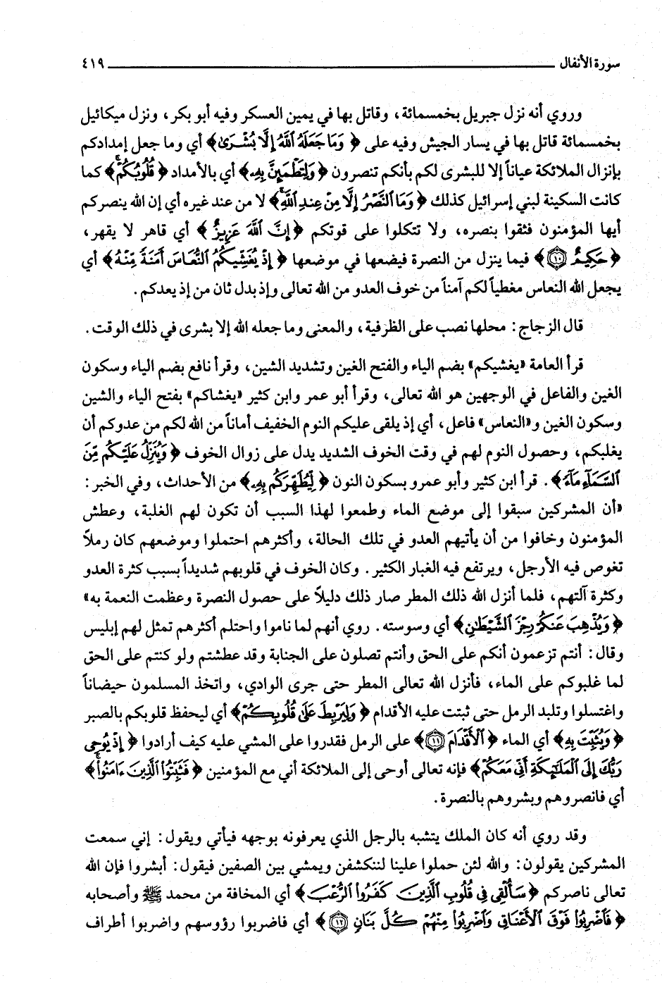 قرأ العامة «يغشيكم» بضم الياء والفتح الغين وتشديد الشين، وقرأ نافع بضم الياء وسكون الغين والفاعل في الوجهين هو الله تعالى، وقرأ أبو عمر وابن كثير «يغشاكم» بفتح الياء والشين وسكون الغين و «النعاس» فاعل، أي إذ يلقى عليكم النوم الخفيف أمانا من الله لكم من عدوكم أن يغلبكم، وحصول النوم لهم في وقت الخوف الشديد يدل على زوال الخوف وَيُنَزِّلُ عَلَيْكُمْ مِنَ السَّماءِ ماءً. قرأ ابن كثير وأبو عمرو بسكون النون لِيُطَهِّرَكُمْ بِهِ من الأحداث، وفي الخبر: