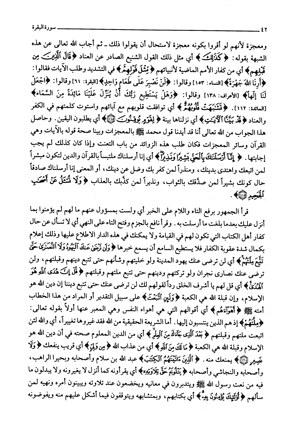 قرأ الجمهور برفع التاء واللام على الخبر أي ولست بمسؤول عنهم ما لهم لم يؤمنوا بما أنزل عليك بعد ما بلغت ما أرسلت به. وقرأ نافع بالجزم وفتح التاء على النهي أي لا تسأل عن حال كفار أهل الكتاب التي تكون لهم في القيامة ولا يمكنك في هذه الدار الاطلاع عليها وذلك إعلام بكمال شدة عقوبة الكفار فلا يستطيع السامع أن يسمع خبرها وَلَنْ تَرْضى عَنْكَ الْيَهُودُ وَلَا النَّصارى حَتَّى تَتَّبِعَ مِلَّتَهُمْ أي لن ترضى عنك يهود المدينة ولو خليتهم وشأنهم حتى تتبع دينهم وقبلتهم، ولن ترضى عنك نصارى نجران ولو تركتهم ودينهم حتى تتبع ملتهم وقبلتهم قُلْ إِنَّ هُدَى اللَّهِ هُوَ الْهُدى أي قل لهم يا أشرف الخلق ردا لقولهم لك لن ترضى عنك حتى تتبع ديننا إن دين الله هو الإسلام، وإن قبلة الله هي الكعبة وَلَئِنِ اتَّبَعْتَ على سبيل التقدير أو المراد من هذا الخطاب أمته صلّى الله عليه وسلّم أَهْواءَهُمْ أي أقوالهم التي هي أهواء النفس وهي المعبر عنها أولا بقوله تعالى: