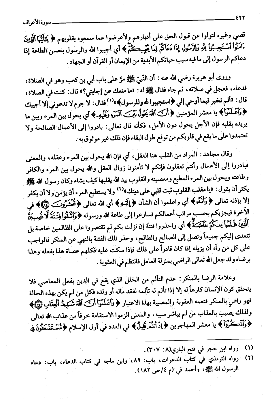 قصي وغيره لتولوا عن قبول الحق على أدبارهم ولأعرضوا عما سمعوه بقلوبهم يا أَيُّهَا الَّذِينَ آمَنُوا اسْتَجِيبُوا لِلَّهِ وَلِلرَّسُولِ إِذا دَعاكُمْ لِما يُحْيِيكُمْ أي أجيبوا الله والرسول بحسن الطاعة إذا دعاكم الرسول إلى ما فيه سبب حياتكم الأبدية من الإيمان أو القرآن أو الجهاد.