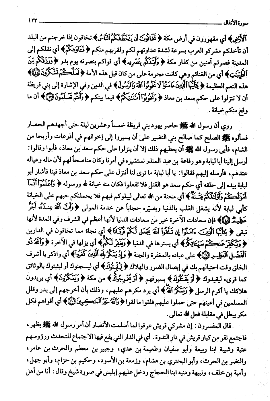 (28) فإن سعادات الآخرة خير من سعادات الدنيا لأنها أعظم في الشرف وفي المدة لأنها تبقى يا أَيُّهَا الَّذِينَ آمَنُوا إِنْ تَتَّقُوا اللَّهَ يَجْعَلْ لَكُمْ فُرْقاناً أي نجاة مما تخافون في الدارين وَيُكَفِّرْ عَنْكُمْ سَيِّئاتِكُمْ أي يسترها في الدنيا وَيَغْفِرْ لَكُمْ أي يزلها في الآخرة وَاللَّهُ ذُو الْفَضْلِ الْعَظِيمِ (29) على عباده بالمغفرة والجنة وَإِذْ يَمْكُرُ بِكَ الَّذِينَ كَفَرُوا أي واذكر يا أشرف الخلق وقت احتيالهم بك في إيصال الضرر والهلاك لِيُثْبِتُوكَ أي ليسجنوك أو ليثبتوك بالوثائق كما قرئ ليقيدوك أَوْ يَقْتُلُوكَ بسيوفهم أَوْ يُخْرِجُوكَ من مكة وَيَمْكُرُونَ أي يريدون هلاكك يا أكرم الرسل وَيَمْكُرُ اللَّهُ أي يرد مكرهم عليهم، وذلك بأن أخرجهم إلى بدر وقلل المسلمين في أعينهم حتى حملوا عليهم فلقوا ما لقوا وَاللَّهُ خَيْرُ الْماكِرِينَ (30) أي أقواهم فكل مكر يبطل في مقابلة فعل الله تعالى.