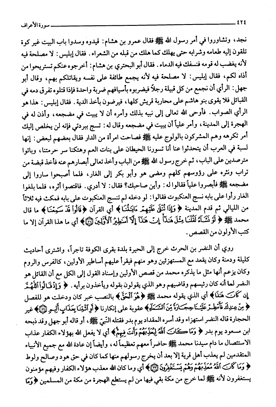 نجد، وتشاوروا في أمر رسول الله صلّى الله عليه وسلّم فقال عمرو بن هشام: قيدوه وسدوا باب البيت غير كوة تلقون إليه طعامه وشرابه حتى يهلك كما هلك من قبله من الشعراء. فقال إبليس: لا مصلحة فيه لأنه يغضب له قومه فنسفك فيه الدماء. فقال أبو البحتري بن هشام: أخرجوه عنكم تستريحوا من أذاه لكم، فقال إبليس: لا مصلحة فيه لأنه يجمع طائفة على نفسه ويقاتلكم بهم، وقال أبو جهل: الرأي أن نجمع من كل قبيلة رجلا فيضربوه بأسيافهم ضربة واحدة فإذا قتلوه تفرق دمه في القبائل فلا يقوى بنو هاشم على محاربة قريش كلها، فيرضون بأخذ الدية. فقال إبليس: هذا هو الرأي الصواب. فأوحى الله تعالى إلى نبيه بذلك وأمره أن لا يبيت في مضجعه، وأذن له في الهجرة إلى المدينة،