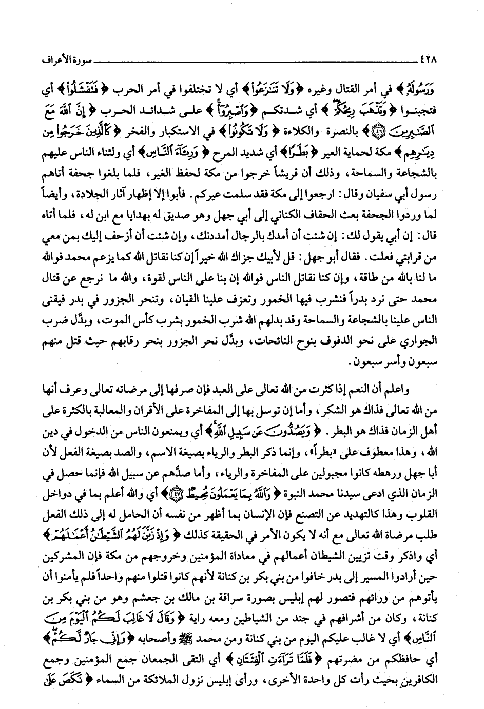 واعلم أن النعم إذا كثرت من الله تعالى على العبد فإن صرفها إلى مرضاته تعالى وعرف أنها من الله تعالى فذاك هو الشكر، وأما إن توسل بها إلى المفاخرة على الأقران والمغالبة بالكثرة على أهل الزمان فذاك هو البطر. وَيَصُدُّونَ عَنْ سَبِيلِ اللَّهِ أي ويمنعون الناس من الدخول في دين الله، وهذا معطوف على «بطرا» ، وإنما ذكر البطر والرياء بصيغة الاسم، والصد بصيغة الفعل لأن أبا جهل ورهطه كانوا مجبولين على المفاخرة والرياء، وأما صدّهم عن سبيل الله فإنما حصل في الزمان الذي ادعى سيدنا محمد النبوة وَاللَّهُ بِما يَعْمَلُونَ مُحِيطٌ (47) أي واللَّه أعلم بما في دواخل القلوب وهذا كالتهديد عن التصنع فإن الإنسان بما أظهر من نفسه أن الحامل له إلى ذلك الفعل طلب مرضاة الله تعالى مع أنه لا يكون الأمر في الحقيقة كذلك وَإِذْ زَيَّنَ لَهُمُ الشَّيْطانُ أَعْمالَهُمْ أي واذكر وقت تزيين الشيطان أعمالهم في معاداة المؤمنين وخروجهم من مكة فإن المشركين حين أرادوا المسير إلى بدر خافوا من بني بكر بن كنانة لأنهم كانوا قتلوا منهم واحدا فلم يأمنوا أن يأتوهم من ورائهم فتصور لهم إبليس بصورة سراقة بن مالك بن جعشم وهو من بني بكر بن كنانة، وكان من أشرافهم في جند من الشياطين ومعه راية وَقالَ لا غالِبَ لَكُمُ الْيَوْمَ مِنَ النَّاسِ أي لا غالب عليكم اليوم من بني كنانة ومن محمد صلّى الله عليه وسلّم وأصحابه وَإِنِّي جارٌ لَكُمْ أي حافظكم من مضرتهم فَلَمَّا تَراءَتِ الْفِئَتانِ أي التقى الجمعان جمع المؤمنين وجمع الكافرين بحيث رأت كل واحدة الأخرى، ورأى إبليس نزول الملائكة من السماء نَكَصَ عَلى