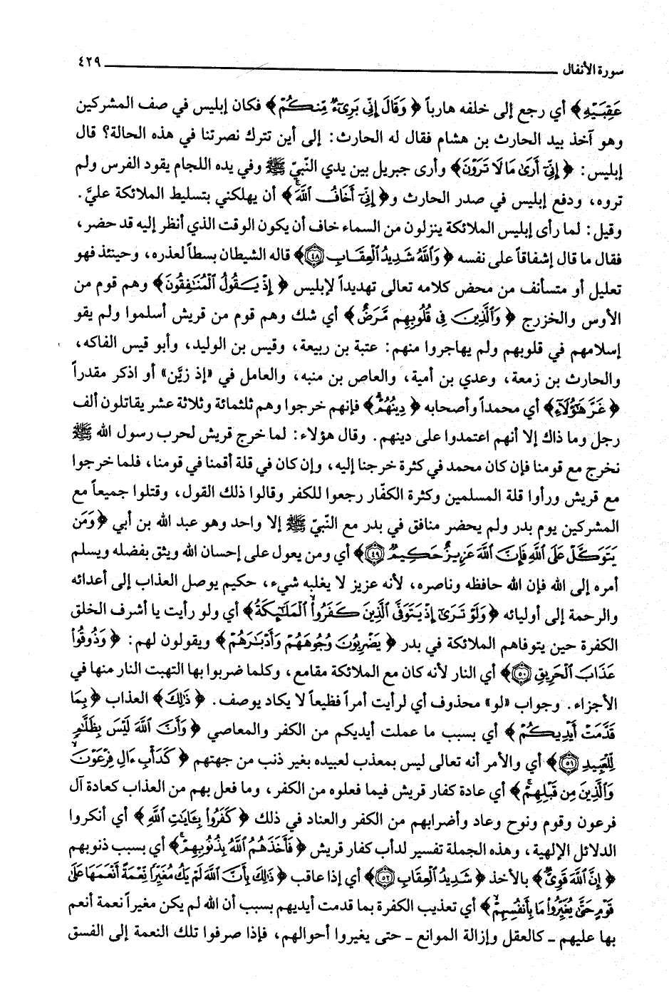 وقيل: لما رأى إبليس الملائكة ينزلون من السماء خاف أن يكون الوقت الذي أنظر إليه قد حضر، فقال ما قال إشفاقا على نفسه وَاللَّهُ شَدِيدُ الْعِقابِ (48) قاله الشيطان بسطا لعذره، وحينئذ فهو تعليل أو مستأنف من محض كلامه تعالى تهديدا لإبليس إِذْ يَقُولُ الْمُنافِقُونَ وهم قوم من الأوس والخزرج وَالَّذِينَ فِي قُلُوبِهِمْ مَرَضٌ أي شك وهم قوم من قريش أسلموا ولم يقو إسلامهم في قلوبهم ولم يهاجروا منهم: عتبة بن ربيعة، وقيس بن الوليد، وأبو قيس الفاكه، والحارث بن زمعة، وعدي بن أمية، والعاص بن منبه، والعامل في «إذ زيّن» أو اذكر مقدرا غَرَّ هؤُلاءِ أي محمدا وأصحابه دِينُهُمْ فإنهم خرجوا وهم ثلاثمائة وثلاثة عشر يقاتلون ألف رجل وما ذاك إلا أنهم اعتمدوا على دينهم. وقال هؤلاء: لما خرج قريش لحرب رسول الله صلّى الله عليه وسلّم نخرج مع قومنا فإن كان محمد في كثرة خرجنا إليه، وإن كان في قلة أقمنا في قومنا، فلما خرجوا مع قريش ورأوا قلة المسلمين وكثرة الكفّار رجعوا للكفر وقالوا ذلك القول، وقتلوا جميعا مع المشركين يوم بدر ولم يحضر منافق في بدر مع النّبيّ صلّى الله عليه وسلّم إلا واحد وهو عبد الله بن أبي وَمَنْ يَتَوَكَّلْ عَلَى اللَّهِ فَإِنَّ اللَّهَ عَزِيزٌ حَكِيمٌ (49) أي ومن يعول على إحسان الله ويثق بفضله ويسلم أمره إلى الله فإن الله حافظه وناصره، لأنه عزيز لا يغلبه شيء، حكيم يوصل العذاب إلى أعدائه والرحمة إلى أوليائه وَلَوْ تَرى إِذْ يَتَوَفَّى الَّذِينَ كَفَرُوا الْمَلائِكَةُ أي ولو رأيت يا أشرف الخلق الكفرة حين يتوفاهم الملائكة في بدر يَضْرِبُونَ وُجُوهَهُمْ وَأَدْبارَهُمْ ويقولون لهم: وَذُوقُوا عَذابَ الْحَرِيقِ (50) أي النار لأنه كان مع الملائكة مقامع، وكلما ضربوا بها التهبت النار منها في الأجزاء. وجواب «لو» محذوف أي لرأيت أمرا فظيعا لا يكاد يوصف.
