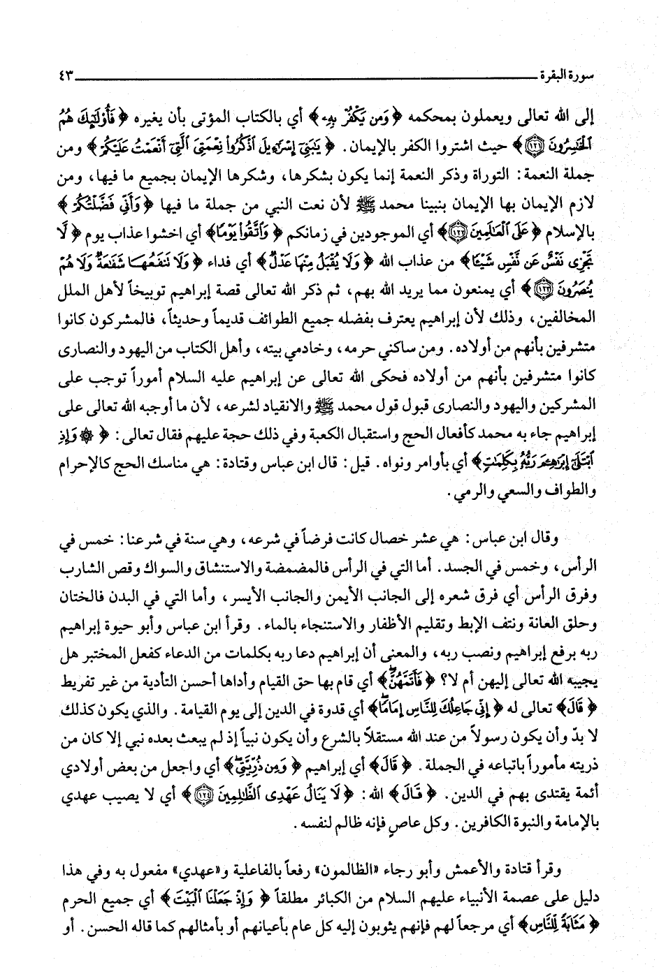 وقال ابن عباس: هي عشر خصال كانت فرضا في شرعه، وهي سنة في شرعنا: خمس في الرأس، وخمس في الجسد. أما التي في الرأس فالمضمضة والاستنشاق والسواك وقص الشارب وفرق الرأس أي فرق شعره إلى الجانب الأيمن والجانب الأيسر، وأما التي في البدن فالختان وحلق العانة ونتف الإبط وتقليم الأظفار والاستنجاء بالماء. وقرأ ابن عباس وأبو حيوة إبراهيم ربه برفع إبراهيم ونصب ربه، والمعنى أن إبراهيم دعا ربه بكلمات من الدعاء كفعل المختبر هل يجيبه الله تعالى إليهن أم لا؟ فَأَتَمَّهُنَّ أي قام بها حق القيام وأداها أحسن التأدية من غير تفريط قالَ تعالى له إِنِّي جاعِلُكَ لِلنَّاسِ إِماماً أي قدوة في الدين إلى يوم القيامة. والذي يكون كذلك لا بدّ وأن يكون رسولا من عند الله مستقلا بالشرع وأن يكون نبيا إذ لم يبعث بعده نبي إلا كان من ذريته مأمورا باتباعه في الجملة. قالَ أي إبراهيم وَمِنْ ذُرِّيَّتِي أي واجعل من بعض أولادي أئمة يقتدى بهم في الدين. قالَ الله: لا يَنالُ عَهْدِي الظَّالِمِينَ (124) أي لا يصيب عهدي بالإمامة والنبوة الكافرين. وكل عاص فإنه ظالم لنفسه.