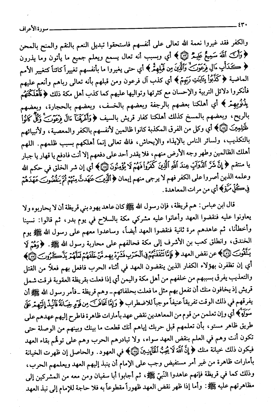 والكفر فقد غيروا نعمة الله تعالى على أنفسهم فاستحقوا تبديل النعم بالنقم والمنح بالمحن وَأَنَّ اللَّهَ سَمِيعٌ عَلِيمٌ (53) أي وبسبب أنه تعال يسمع ويعلم جميع ما يأتون وما يذرون كَدَأْبِ آلِ فِرْعَوْنَ وَالَّذِينَ مِنْ قَبْلِهِمْ أي حتى يغيروا ما بأنفسهم تغييرا كائنا كتغيير الأمم الماضية كَذَّبُوا بِآياتِ رَبِّهِمْ أي كذب آل فرعون ومن قبلهم بأنه تعالى رباهم وأنعم عليهم فأنكروا دلائل التربية والإحسان مع كثرتها وتواليها عليهم كما كذب أهل مكة ذلك فَأَهْلَكْناهُمْ بِذُنُوبِهِمْ أي أهلكنا بعضهم بالرجفة وبعضهم بالخسف، وبعضهم بالحجارة، وبعضهم بالريح، وبعضهم بالمسخ كذلك أهلكنا كفار قريش بالسيف وَأَغْرَقْنا آلَ فِرْعَوْنَ وَكُلٌّ كانُوا ظالِمِينَ (54) أي وكل من الفرق المكذبة كانوا ظالمين لأنفسهم بالكفر والمعصية، ولأنبيائهم بالتكذيب، ولسائر الناس بالإيذاء والإيحاش، فالله تعالى إنما أهلكهم بسبب ظلمهم. اللهم أهلك الظالمين وطهر وجه الأرض منهم، فلا يقدر أحد على دفعهم إلا أنت فادفع يا قهار يا جبار يا منتقم إِنَّ شَرَّ الدَّوَابِّ عِنْدَ اللَّهِ الَّذِينَ كَفَرُوا فَهُمْ لا يُؤْمِنُونَ (55) أي إن شر الخلق في حكم الله وعلمه الذين أصروا على الكفر فهم لا يرجى منهم إيمان الَّذِينَ عاهَدْتَ مِنْهُمْ ثُمَّ يَنْقُضُونَ عَهْدَهُمْ فِي كُلِّ مَرَّةٍ أي من مرات المعاهدة.
