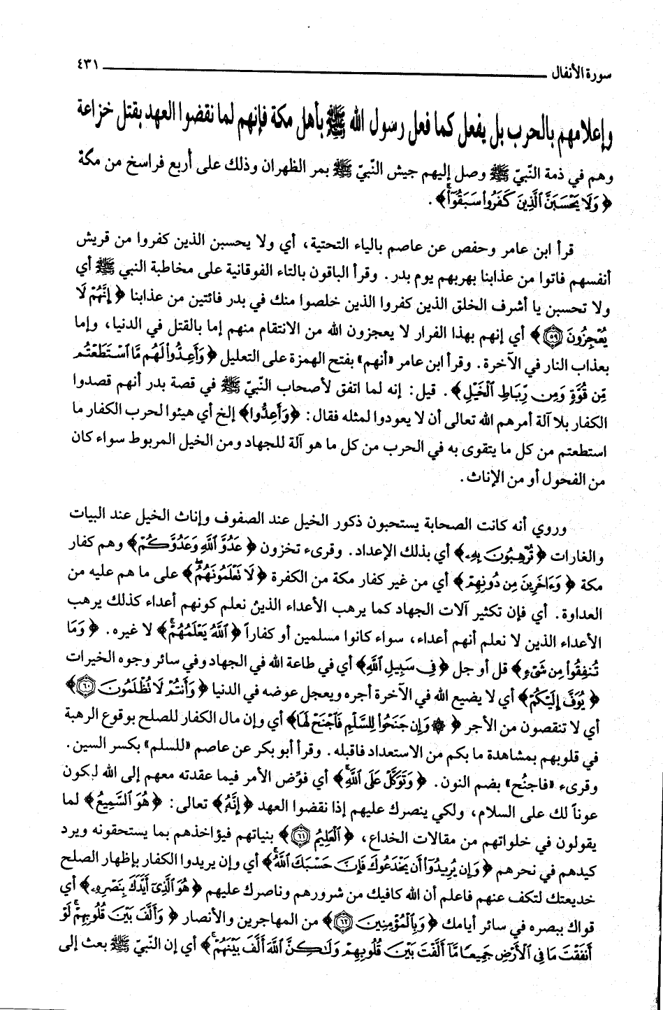 قرأ ابن عامر وحفص عن عاصم بالياء التحتية، أي ولا يحسبنّ الذين كفروا من قريش أنفسهم فاتوا من عذابنا بهر بهم يوم بدر. وقرأ الباقون بالتاء الفوقانية على مخاطبة النبي صلّى الله عليه وسلّم أي ولا تحسبن يا أشرف الخلق الذين كفروا الذين خلصوا منك في بدر فائتين من عذابنا إِنَّهُمْ لا يُعْجِزُونَ (59) أي إنهم بهذا الفرار لا يعجزون الله من الانتقام منهم إما بالقتل في الدنيا، وإما بعذاب النار في الآخرة. وقرأ ابن عامر «أنهم» بفتح الهمزة على التعليل وَأَعِدُّوا لَهُمْ مَا اسْتَطَعْتُمْ مِنْ قُوَّةٍ وَمِنْ