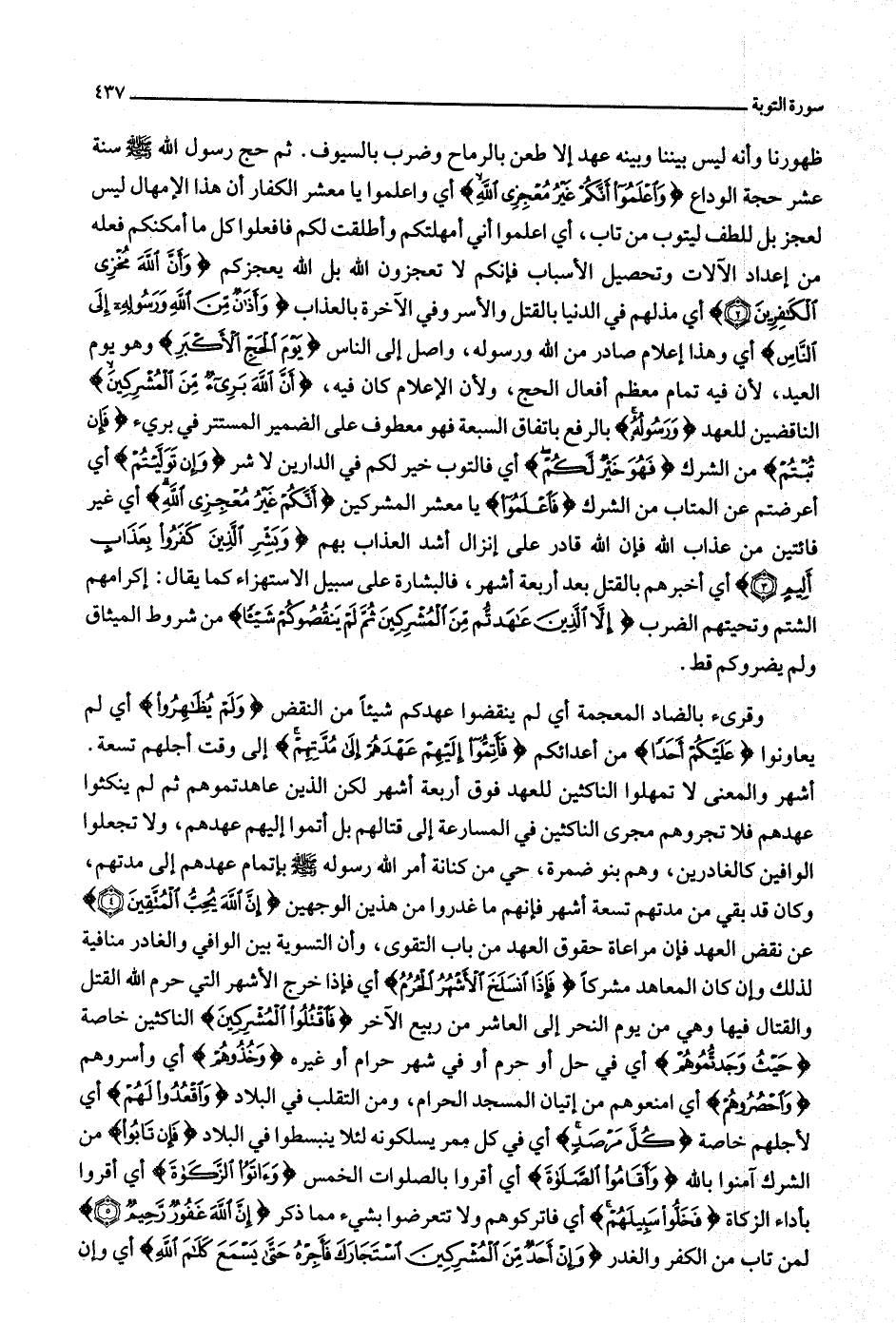 وَاعْلَمُوا أَنَّكُمْ غَيْرُ مُعْجِزِي اللَّهِ أي واعلموا يا معشر الكفار أن هذا الإمهال ليس لعجز بل للطف ليتوب من تاب، أي اعلموا أني أمهلتكم وأطلقت لكم فافعلوا كل ما أمكنكم فعله من إعداد الآلات وتحصيل الأسباب فإنكم لا تعجزون الله بل الله يعجزكم وَأَنَّ اللَّهَ مُخْزِي الْكافِرِينَ (2) أي مذلهم في الدنيا بالقتل والأسر وفي الآخرة بالعذاب وَأَذانٌ مِنَ اللَّهِ وَرَسُولِهِ إِلَى النَّاسِ أي وهذا إعلام صادر من الله ورسوله، واصل إلى الناس يَوْمَ الْحَجِّ الْأَكْبَرِ وهو يوم العيد، لأن فيه تمام معظم أفعال الحج، ولأن الإعلام كان فيه، أَنَّ اللَّهَ بَرِيءٌ مِنَ الْمُشْرِكِينَ الناقضين للعهد وَرَسُولِهِ بالرفع باتفاق السبعة فهو معطوف على الضمير المستتر في برىء فَإِنْ تُبْتُمْ من الشرك فَهُوَ خَيْرٌ لَكُمْ أي فالتوب خير لكم في الدارين لا شر وَإِنْ تَوَلَّيْتُمْ أي أعرضتم عن المتاب من الشرك فَاعْلَمُوا يا معشر المشركين أَنَّكُمْ غَيْرُ مُعْجِزِي اللَّهِ أي غير فائتين من عذاب الله فإن الله قادر على إنزال أشد العذاب بهم وَبَشِّرِ الَّذِينَ كَفَرُوا بِعَذابٍ أَلِيمٍ (3) أي أخبرهم بالقتل بعد أربعة أشهر، فالبشارة على سبيل الاستهزاء كما يقال: إكرامهم الشتم وتحيتهم الضرب إِلَّا الَّذِينَ عاهَدْتُمْ مِنَ الْمُشْرِكِينَ ثُمَّ لَمْ يَنْقُصُوكُمْ شَيْئاً من شروط الميثاق ولم يضروكم قط.