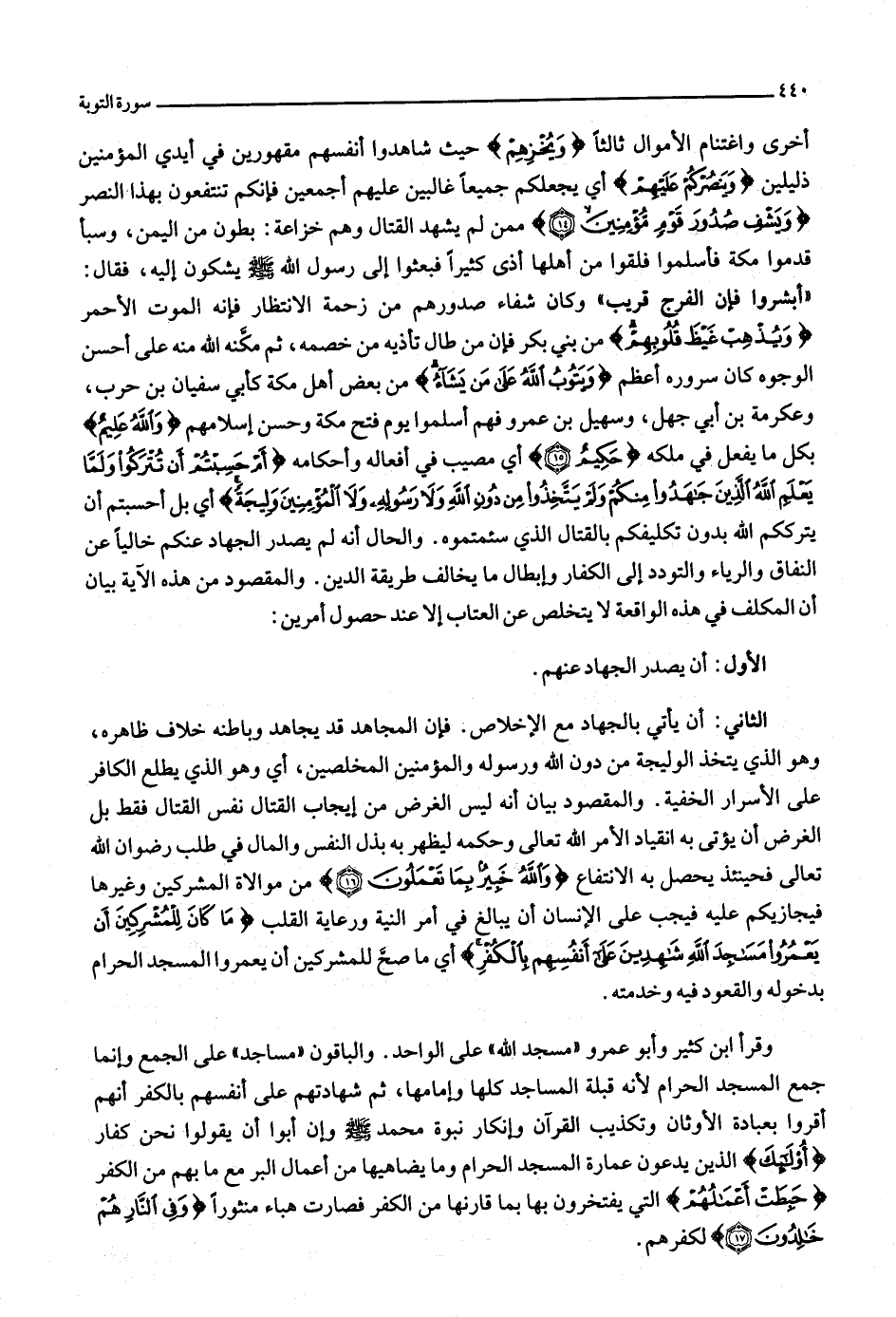الثاني: أن يأتي بالجهاد مع الإخلاص. فإن المجاهد قد يجاهد وباطنه خلاف ظاهره، وهو الذي يتخذ الوليجة من دون الله ورسوله والمؤمنين المخلصين، أي وهو الذي يطلع الكافر على الأسرار الخفية. والمقصود بيان أنه ليس الغرض من إيجاب القتال نفس القتال فقط بل الغرض أن يؤتى به انقياد الأمر الله تعالى وحكمه ليظهر به بذل النفس والمال في طلب رضوان الله تعالى فحينئذ يحصل به الانتفاع وَاللَّهُ خَبِيرٌ بِما تَعْمَلُونَ (16) من موالاة المشركين وغيرها فيجازيكم عليه فيجب على الإنسان أن يبالغ في أمر النية ورعاية القلب ما كانَ لِلْمُشْرِكِينَ أَنْ يَعْمُرُوا مَساجِدَ اللَّهِ شاهِدِينَ عَلى أَنْفُسِهِمْ بِالْكُفْرِ أي ما صحّ للمشركين أن يعمروا المسجد الحرام بدخوله والقعود
