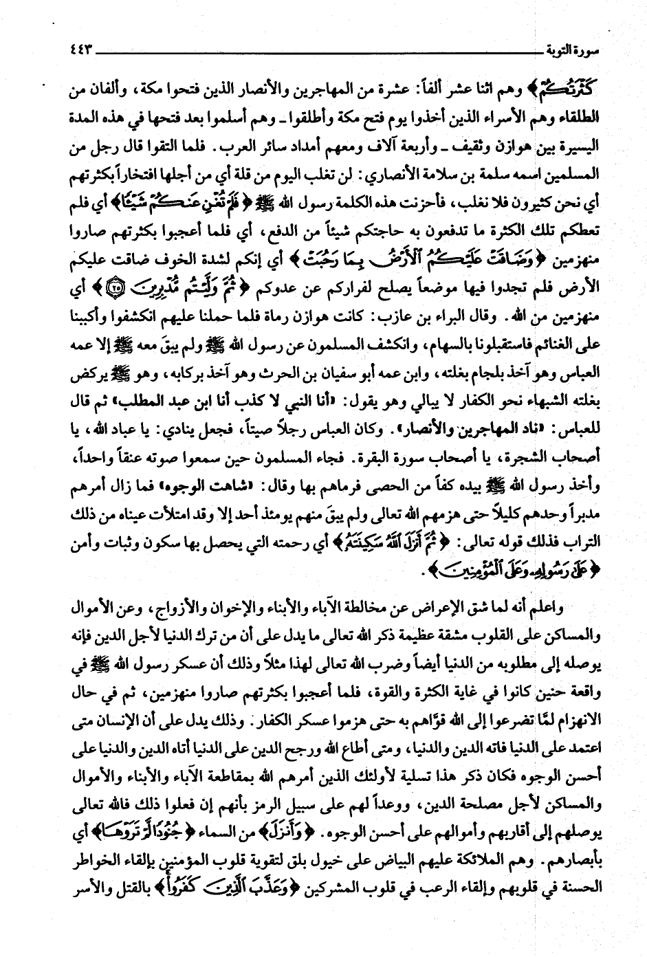 وهم اثنا عشر ألفا: عشرة من المهاجرين والأنصار الذين فتحوا مكة، وألفان من الطلقاء وهم الأسراء الذين أخذوا يوم فتح مكة وأطلقوا- وهم أسلموا بعد فتحها في هذه المدة اليسيرة بين هوازن وثقيف- وأربعة آلاف ومعهم أمداد سائر العرب. فلما التقوا قال رجل من المسلمين اسمه سلمة بن سلامة الأنصاري: لن تغلب اليوم من قلة أي من أجلها افتخارا بكثرتهم أي نحن كثيرون فلا نغلب، فأحزنت هذه الكلمة رسول الله صلّى الله عليه وسلّم فَلَمْ تُغْنِ عَنْكُمْ شَيْئاً أي فلم تعطكم تلك الكثرة ما تدفعون به حاجتكم شيئا من الدفع، أي فلما أعجبوا بكثرتهم صاروا منهزمين وَضاقَتْ عَلَيْكُمُ الْأَرْضُ بِما رَحُبَتْ أي إنكم لشدة الخوف ضاقت عليكم الأرض فلم تجدوا فيها موضعا يصلح لفراركم عن عدوكم ثُمَّ وَلَّيْتُمْ مُدْبِرِينَ (25) أي منهزمين من الله.