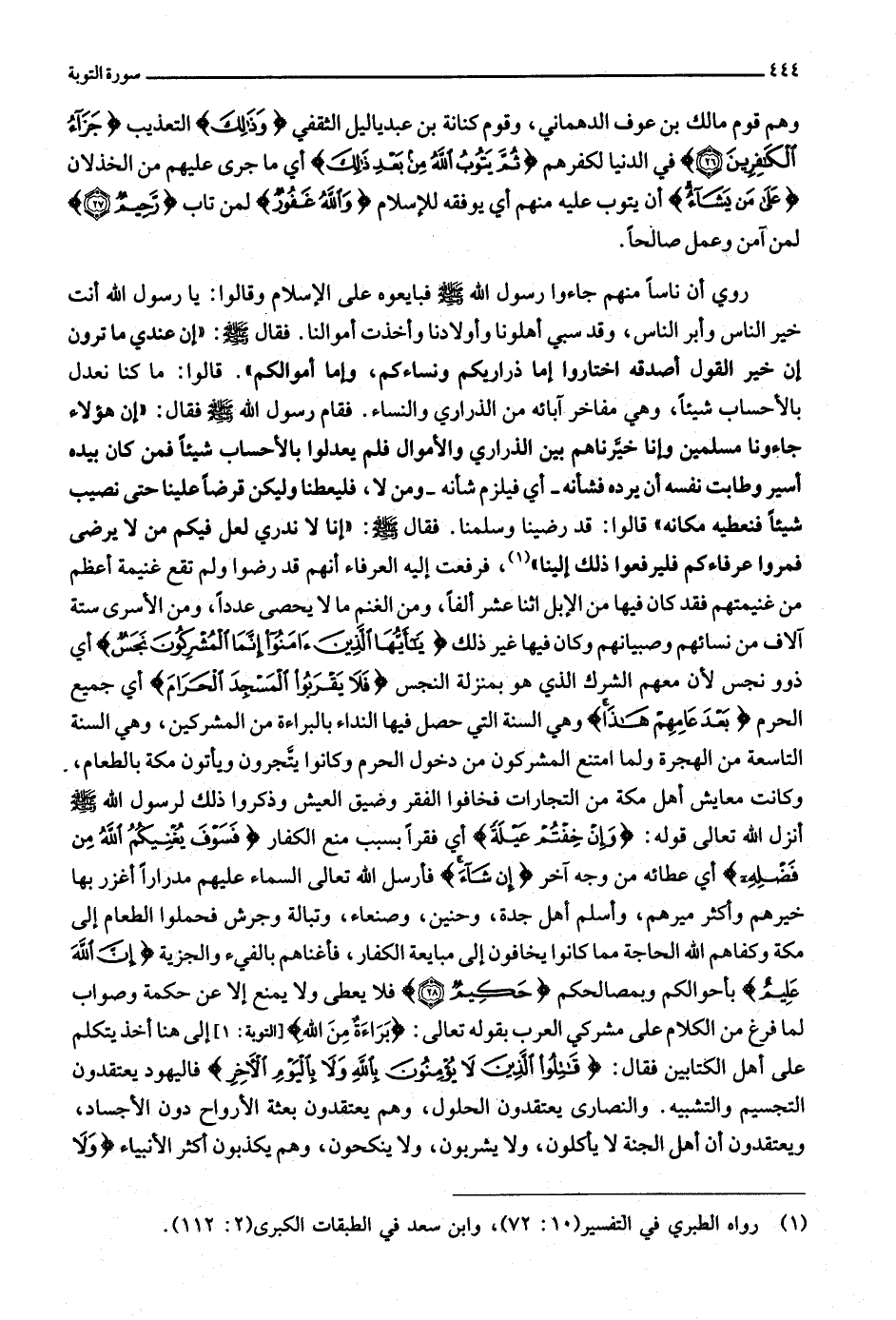 «1» ، فرفعت إليه العرفاء أنهم قد رضوا ولم تقع غنيمة أعظم من غنيمتهم فقد كان فيها من الإبل اثنا عشر ألفا، ومن الغنم ما لا يحصى عددا، ومن الأسرى ستة آلاف من نسائهم وصبيانهم وكان فيها غير ذلك يا أَيُّهَا الَّذِينَ آمَنُوا إِنَّمَا الْمُشْرِكُونَ نَجَسٌ أي ذوو نجس لأن معهم الشرك الذي هو بمنزلة النجس فَلا يَقْرَبُوا الْمَسْجِدَ الْحَرامَ أي جميع الحرم بَعْدَ عامِهِمْ هذا وهي السنة التي حصل فيها النداء بالبراءة من المشركين، وهي السنة التاسعة من الهجرة ولما امتنع المشركون من دخول الحرم وكانوا يتّجرون ويأتون مكة بالطعام، وكانت معايش أهل مكة من التجارات فخافوا الفقر وضيق العيش وذكروا ذلك لرسول الله صلّى الله عليه وسلّم أنزل الله تعالى قوله: وَإِنْ خِفْتُمْ عَيْلَةً أي فقرا بسبب منع الكفار فَسَوْفَ يُغْنِيكُمُ اللَّهُ مِنْ فَضْلِهِ أي عطائه من وجه آخر إِنْ شاءَ فأرسل الله تعالى السماء عليهم مدرارا أغزر بها خيرهم وأكثر ميرهم، وأسلم أهل جدة، وحنين، وصنعاء، وتبالة وجرش فحملوا الطعام إلى مكة وكفاهم الله الحاجة مما كانوا يخافون إلى مبايعة الكفار، فأغناهم بالفيء والجزية إِنَّ اللَّهَ عَلِيمٌ بأحوالكم وبمصالحكم حَكِيمٌ (28) فلا يعطى ولا يمنع إلا عن حكمة وصواب لما فرغ من الكلام على مشركي العرب بقوله تعالى: بَراءَةٌ مِنَ اللَّهِ [التوبة: 1] إلى هنا أخذ يتكلم على أهل الكتابين فقال: قاتِلُوا الَّذِينَ لا يُؤْمِنُونَ بِاللَّهِ وَلا بِالْيَوْمِ الْآخِرِ فاليهود يعتقدون التجسيم والتشبيه. والنصارى يعتقدون الحلول، وهم يعتقدون بعثة الأرواح دون الأجساد، ويعتقدون أن أهل الجنة لا يأكلون، ولا يشربون، ولا ينكحون، وهم يكذبون أكثر الأنبياء