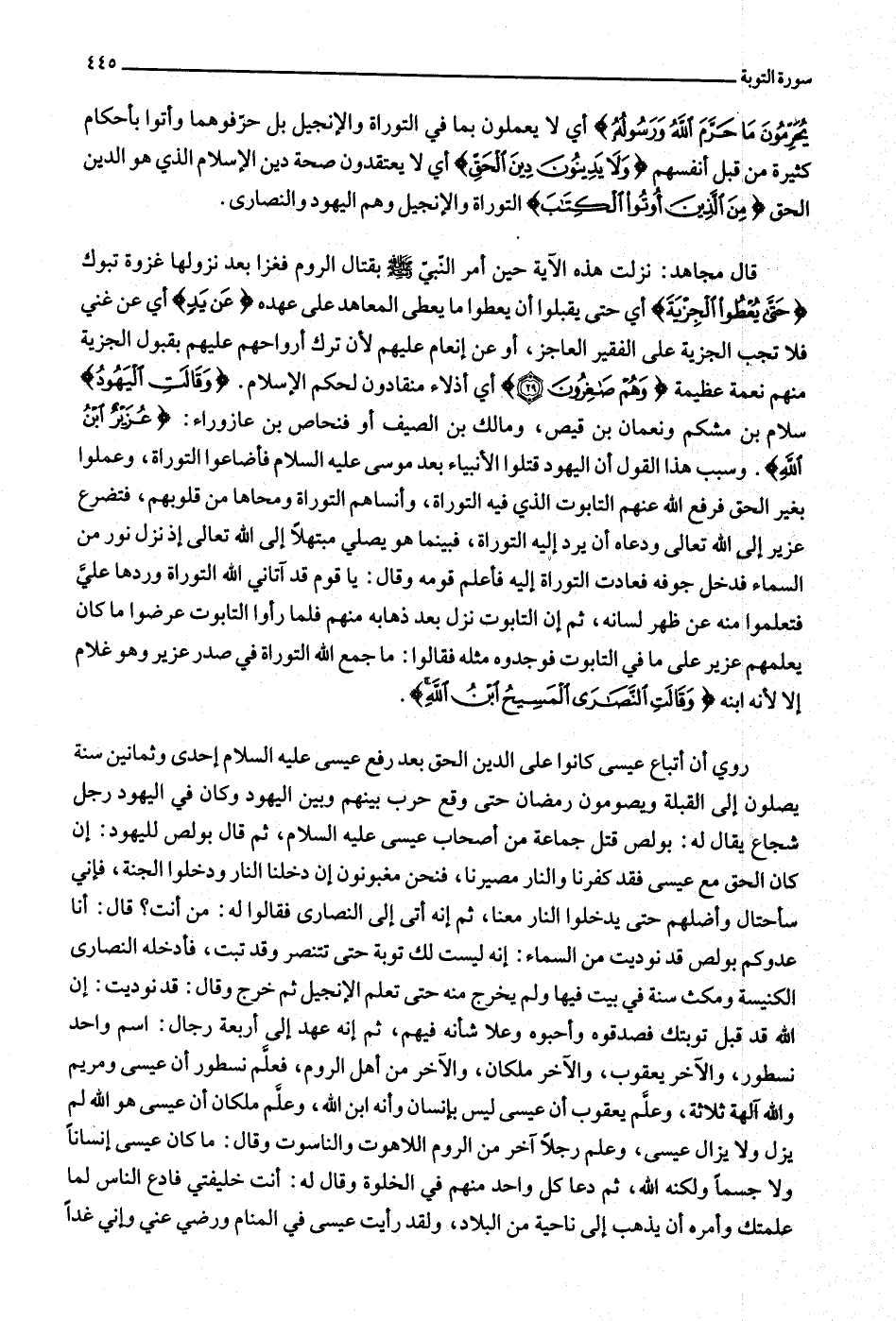 قال مجاهد: نزلت هذه الآية حين أمر النّبيّ صلّى الله عليه وسلّم بقتال الروم فغزا بعد نزولها غزوة تبوك حَتَّى يُعْطُوا الْجِزْيَةَ أي حتى يقبلوا أن يعطوا ما يعطى المعاهد على عهده عَنْ يَدٍ أي عن غني فلا تجب الجزية على الفقير العاجز، أو عن إنعام عليهم لأن ترك أرواحهم عليهم بقبول الجزية منهم نعمة عظيمة وَهُمْ صاغِرُونَ (29) أي أذلاء منقادون لحكم الإسلام. وَقالَتِ الْيَهُودُ سلام بن مشكم ونعمان بن قيس، ومالك بن الصيف أو فنحاص بن عازوراء: عُزَيْرٌ ابْنُ اللَّهِ. وسبب هذا القول أن اليهود قتلوا الأنبياء بعد موسى عليه السلام فأضاعوا التوراة، وعملوا بغير الحق فرفع الله عنهم التابوت الذي فيه التوراة، وأنساهم التوراة ومحاها من قلوبهم، فتضرع عزير إلى الله تعالى ودعاه أن يرد إليه التوراة، فبينما هو يصلي مبتهلا إلى الله تعالى إذ نزل نور من السماء فدخل جوفه فعادت التوراة إليه فأعلم قومه وقال: يا قوم قد آتاني الله التوراة وردها عليّ فتعلموا منه عن ظهر لسانه، ثم إن التابوت نزل بعد ذهابه منهم فلما رأوا التابوت عرضوا ما كان يعلمهم عزيز على ما في التابوت فوجدوه مثله فقالوا: ما جمع الله التوراة في صدر عزيز وهو غلام إلا لأنه ابنه وَقالَتِ النَّصارى الْمَسِيحُ ابْنُ اللَّهِ.