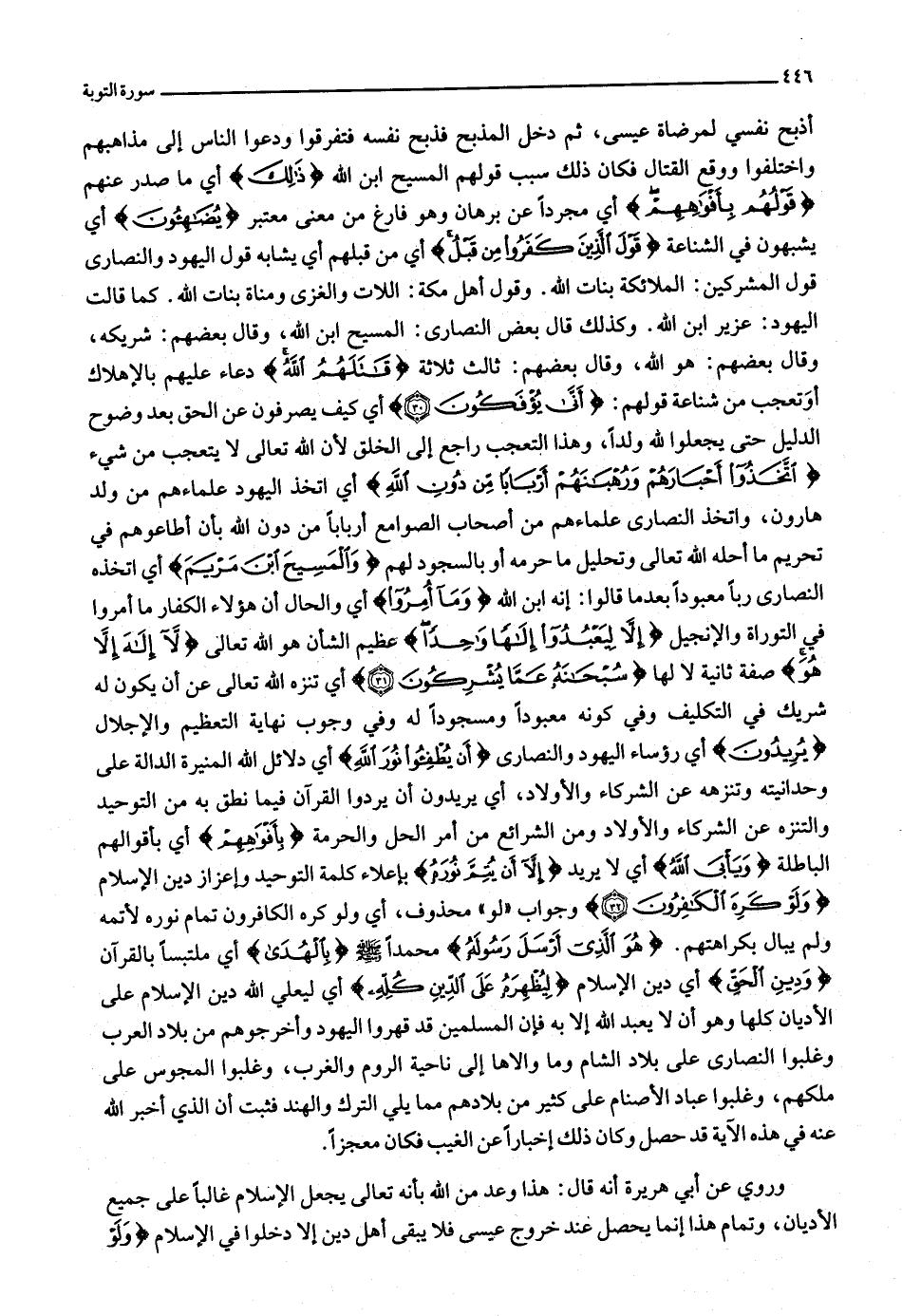 وروي عن أبي هريرة أنه قال: هذا وعد من الله بأنه تعالى يجعل الإسلام غالبا على جميع الأديان، وتمام هذا إنما يحصل عند خروج عيسى فلا يبقى أهل دين إلا دخلوا في الإسلام وَلَوْ