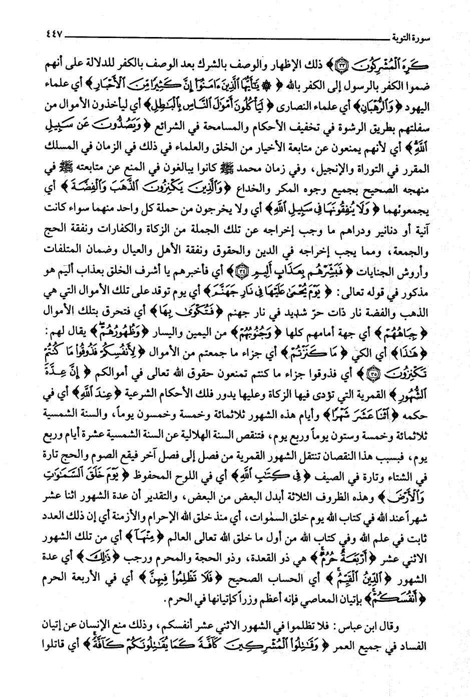 كَرِهَ الْمُشْرِكُونَ (33) ذلك الإظهار والوصف بالشرك بعد الوصف بالكفر للدلالة على أنهم ضموا الكفر بالرسول إلى الكفر بالله يا أَيُّهَا الَّذِينَ آمَنُوا إِنَّ كَثِيراً مِنَ الْأَحْبارِ أي علماء اليهود وَالرُّهْبانِ أي علماء النصارى لَيَأْكُلُونَ أَمْوالَ النَّاسِ بِالْباطِلِ أي ليأخذون الأموال من سفلتهم بطريق الرشوة في تخفيف الأحكام والمسامحة في الشرائع وَيَصُدُّونَ عَنْ سَبِيلِ اللَّهِ أي لأنهم يمنعون عن متابعة الأخيار من الخلق والعلماء في ذلك في الزمان في المسلك المقرر في التوراة والإنجيل، وفي زمان محمد صلّى الله عليه وسلّم كانوا يبالغون في المنع عن متابعته صلّى الله عليه وسلّم في منهجه الصحيح بجميع وجوه المكر والخداع وَالَّذِينَ يَكْنِزُونَ الذَّهَبَ وَالْفِضَّةَ أي يجمعونهما وَلا يُنْفِقُونَها فِي سَبِيلِ اللَّهِ أي ولا يخرجون من حملة كل واحد منهما سواء كانت آنية أو دنانير ودراهم ما وجب إخراجه عن تلك الجملة من الزكاة والكفارات ونفقة الحج والجمعة، ومما يجب إخراجه في الدين والحقوق ونفقة الأهل والعيال وضمان المتلفات وأروش الجنايات فَبَشِّرْهُمْ بِعَذابٍ أَلِيمٍ (34) أي فأخبرهم يا أشرف الخلق بعذاب أليم هو مذكور في قوله تعالى: يَوْمَ يُحْمى عَلَيْها فِي نارِ جَهَنَّمَ أي يوم توقد على تلك الأموال التي هي الذهب والفضة نار ذات حرّ شديد في نار جهنم فَتُكْوى بِها أي فتحرق بتلك الأموال جِباهُهُمْ أي جهة أمامهم كلها وَجُنُوبُهُمْ من اليمين واليسار وَظُهُورُهُمْ يقال لهم: