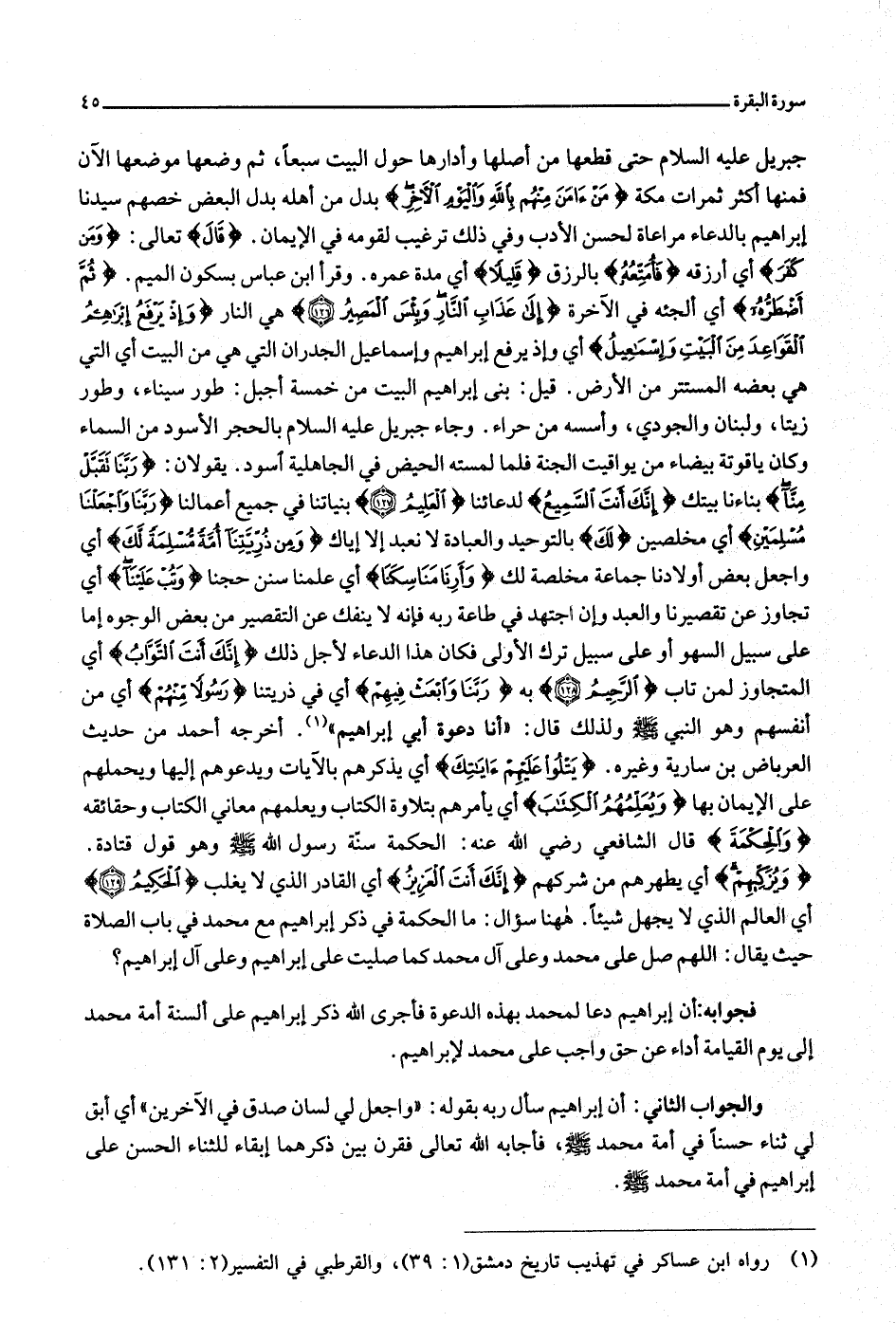 جبريل عليه السلام حتى قطعها من أصلها وأدارها حول البيت سبعا، ثم وضعها موضعها الآن فمنها أكثر ثمرات مكة مَنْ آمَنَ مِنْهُمْ بِاللَّهِ وَالْيَوْمِ الْآخِرِ بدل من أهله بدل البعض خصهم سيدنا إبراهيم بالدعاء مراعاة لحسن الأدب وفي ذلك ترغيب لقومه في الإيمان. قالَ تعالى: وَمَنْ كَفَرَ أي أرزقه فَأُمَتِّعُهُ بالرزق قَلِيلًا أي مدة عمره. وقرأ ابن عباس بسكون الميم. ثُمَّ أَضْطَرُّهُ أي ألجئه في الآخرة إِلى عَذابِ النَّارِ وَبِئْسَ الْمَصِيرُ (126) هي النار وَإِذْ يَرْفَعُ إِبْراهِيمُ الْقَواعِدَ مِنَ الْبَيْتِ وَإِسْماعِيلُ أي وإذ يرفع إبراهيم وإسماعيل الجدران التي هي من البيت أي التي هي بعضه المستتر من الأرض. قيل: بنى إبراهيم البيت من خمسة أجبل: طور سيناء، وطور زيتا، ولبنان والجودي، وأسسه من حراء. وجاء جبريل عليه السلام بالحجر الأسود من السماء وكان ياقوتة بيضاء من يواقيت الجنة فلما لمسته الحيض في الجاهلية اسود. يقولان: رَبَّنا تَقَبَّلْ مِنَّا بناءنا بيتك إِنَّكَ أَنْتَ السَّمِيعُ لدعائنا الْعَلِيمُ (127) بنياتنا في جميع أعمالنا رَبَّنا وَاجْعَلْنا مُسْلِمَيْنِ أي مخلصين لَكَ بالتوحيد والعبادة لا نعبد إلا إياك وَمِنْ ذُرِّيَّتِنا أُمَّةً مُسْلِمَةً لَكَ أي واجعل بعض أولادنا جماعة مخلصة لك وَأَرِنا مَناسِكَنا أي علمنا سنن حجنا وَتُبْ عَلَيْنا أي تجاوز عن تقصيرنا والعبد وإن اجتهد في طاعة ربه فإنه لا ينفك عن التقصير من بعض الوجوه إما على سبيل السهو أو على سبيل ترك الأولى فكان هذا الدعاء لأجل ذلك إِنَّكَ أَنْتَ التَّوَّابُ أي المتجاوز لمن تاب الرَّحِيمُ (128) به رَبَّنا وَابْعَثْ فِيهِمْ أي في ذريتنا رَسُولًا مِنْهُمْ أي من أنفسهم وهو النبي صلّى الله عليه وسلّم ولذلك قال: «أنا دعوة أبي إبراهيم» «1» . أخرجه أحمد من حديث العرباض بن سارية وغيره. يَتْلُوا عَلَيْهِمْ آياتِكَ أي يذكرهم بالآيات ويدعوهم إليها ويحملهم على الإيمان بها وَيُعَلِّمُهُمُ الْكِتابَ أي يأمرهم بتلاوة الكتاب ويعلمهم معاني الكتاب وحقائقه وَالْحِكْمَةَ قال الشافعي رضي الله عنه: الحكمة سنّة رسول الله صلّى الله عليه وسلّم وهو قول قتادة.