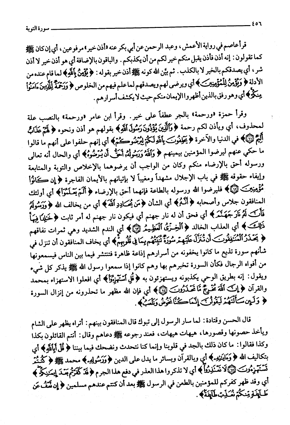 وقرأ حمزة «ورحمة» بالجر عطفا على خير. وقرأ ابن عامر «ورحمة» بالنصب علة لمحذوف، أي ويأذن لكم رحمة وَالَّذِينَ يُؤْذُونَ رَسُولَ اللَّهِ بقولهم هو أذن ونحوه لَهُمْ عَذابٌ أَلِيمٌ (61) في الدنيا والآخرة يَحْلِفُونَ بِاللَّهِ لَكُمْ لِيُرْضُوكُمْ أي إنهم حلفوا على أنهم ما قالوا ما حكي عنهم ليرضوا المؤمنين بيمينهم وَاللَّهُ وَرَسُولُهُ أَحَقُّ أَنْ يُرْضُوهُ أي والحال أنه تعالى ورسوله أحق بالإرضاء منكم وكان من الواجب أن يرضوهما بالإخلاص والتوبة والمتابعة وإيفاء حقوقه صلّى الله عليه وسلّم في باب الإجلال مشهدا ومغيبا لا بإتيانهم بالأيمان الفاجرة إِنْ كانُوا مُؤْمِنِينَ (62) فليرضوا الله ورسوله بالطاعة فإنهما أحق بالإرضاء أَلَمْ يَعْلَمُوا أي أولئك المنافقون جلاس وأصحابه أَنَّهُ أي الشأن مَنْ يُحادِدِ اللَّهَ أي من يخالف الله وَرَسُولَهُ فَأَنَّ لَهُ نارَ جَهَنَّمَ أي فحق أن له نار جهنم أي فيكون نار جهنم له أمر ثابت خالِداً فِيها ذلِكَ أي العذاب الخالد الْخِزْيُ الْعَظِيمُ (63) أي الندم الشديد وهي ثمرات نفاقهم يَحْذَرُ الْمُنافِقُونَ أَنْ تُنَزَّلَ عَلَيْهِمْ سُورَةٌ تُنَبِّئُهُمْ بِما فِي قُلُوبِهِمْ أي يخاف المنافقون أن تنزل في شأنهم سورة تذيع ما كانوا يخفونه من أسرارهم إذاعة ظاهرة فتنتشر فيما بين الناس فيسمعونها من أفواه الرجال فكأن السورة تخبرهم بها وهم كانوا إذا سمعوا رسول الله صلّى الله عليه وسلّم يذكر كل شيء ويقول: إنه بطريق الوحي يكذبونه ويستهزئون به قُلِ اسْتَهْزِؤُا أي افعلوا الاستهزاء بمحمد والقرآن إِنَّ اللَّهَ مُخْرِجٌ ما تَحْذَرُونَ (64) أي فإن الله مظهر ما تحذرونه من إنزال السورة وَلَئِنْ سَأَلْتَهُمْ لَيَقُولُنَّ إِنَّما كُنَّا نَخُوضُ وَنَلْعَبُ.