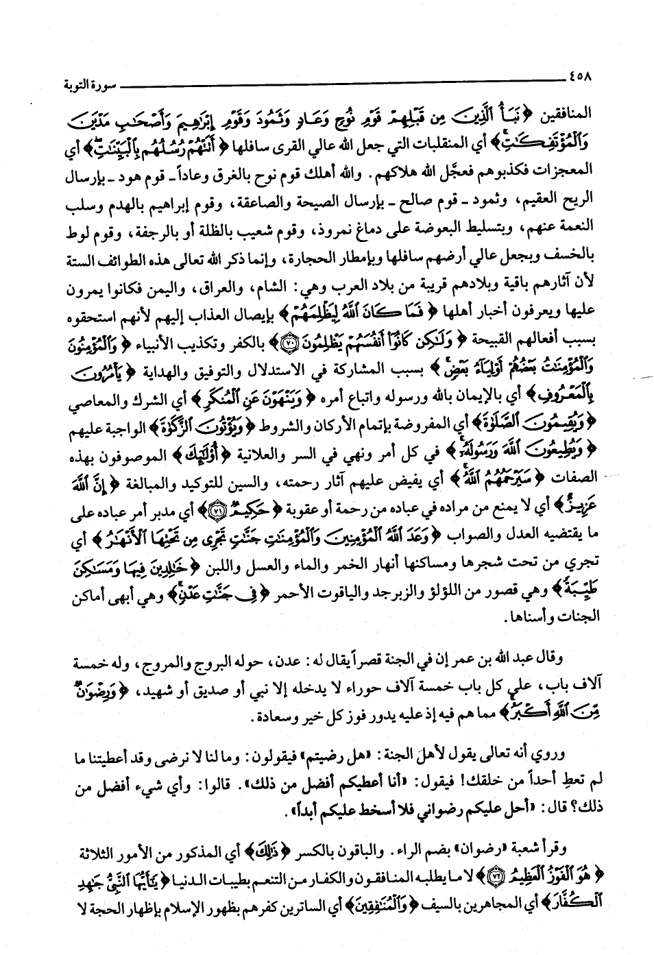 وَالْمُؤْمِنُونَ وَالْمُؤْمِناتُ بَعْضُهُمْ أَوْلِياءُ بَعْضٍ بسبب المشاركة في الاستدلال والتوفيق والهداية يَأْمُرُونَ بِالْمَعْرُوفِ أي بالإيمان بالله ورسوله واتباع أمره وَيَنْهَوْنَ عَنِ الْمُنْكَرِ أي الشرك والمعاصي وَيُقِيمُونَ الصَّلاةَ أي المفروضة بإتمام الأركان والشروط وَيُؤْتُونَ الزَّكاةَ الواجبة عليهم وَيُطِيعُونَ اللَّهَ وَرَسُولَهُ في كل أمر ونهي في السر والعلانية أُولئِكَ الموصوفون بهذه الصفات سَيَرْحَمُهُمُ اللَّهُ أي يفيض عليهم آثار رحمته، والسين للتوكيد والمبالغة إِنَّ اللَّهَ عَزِيزٌ أي لا يمنع من مراده في عباده من رحمة أو عقوبة حَكِيمٌ (71) أي مدبر أمر عباده على ما يقتضيه العدل والصواب وَعَدَ اللَّهُ الْمُؤْمِنِينَ وَالْمُؤْمِناتِ جَنَّاتٍ تَجْرِي مِنْ تَحْتِهَا الْأَنْهارُ أي تجري من تحت شجرها ومساكنها أنهار الخمر والماء والعسل واللبن خالِدِينَ فِيها وَمَساكِنَ طَيِّبَةً وهي قصور من اللؤلؤ والزبرجد والياقوت الأحمر فِي جَنَّاتِ عَدْنٍ وهي أبهى أماكن الجنات وأسناها.