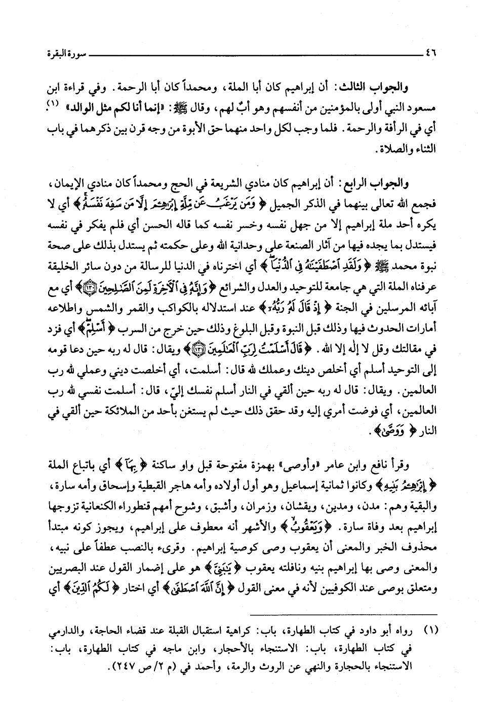 والجواب الرابع: أن إبراهيم كان منادي الشريعة في الحج ومحمدا كان منادي الإيمان، فجمع الله تعالى بينهما في الذكر الجميل وَمَنْ يَرْغَبُ عَنْ مِلَّةِ إِبْراهِيمَ إِلَّا مَنْ سَفِهَ نَفْسَهُ أي لا يكره أحد ملة إبراهيم إلا من جهل نفسه وخسر نفسه كما قاله الحسن أي فلم يفكر في نفسه فيستدل بما يجده فيها من آثار الصنعة على وحدانية الله وعلى حكمته ثم يستدل بذلك على صحة نبوة محمد صلّى الله عليه وسلّم وَلَقَدِ اصْطَفَيْناهُ فِي الدُّنْيا أي اخترناه في الدنيا للرسالة من دون سائر الخليقة عرفناه الملة التي هي جامعة للتوحيد والعدل والشرائع وَإِنَّهُ فِي الْآخِرَةِ لَمِنَ الصَّالِحِينَ (130) أي مع آبائه المرسلين في الجنة