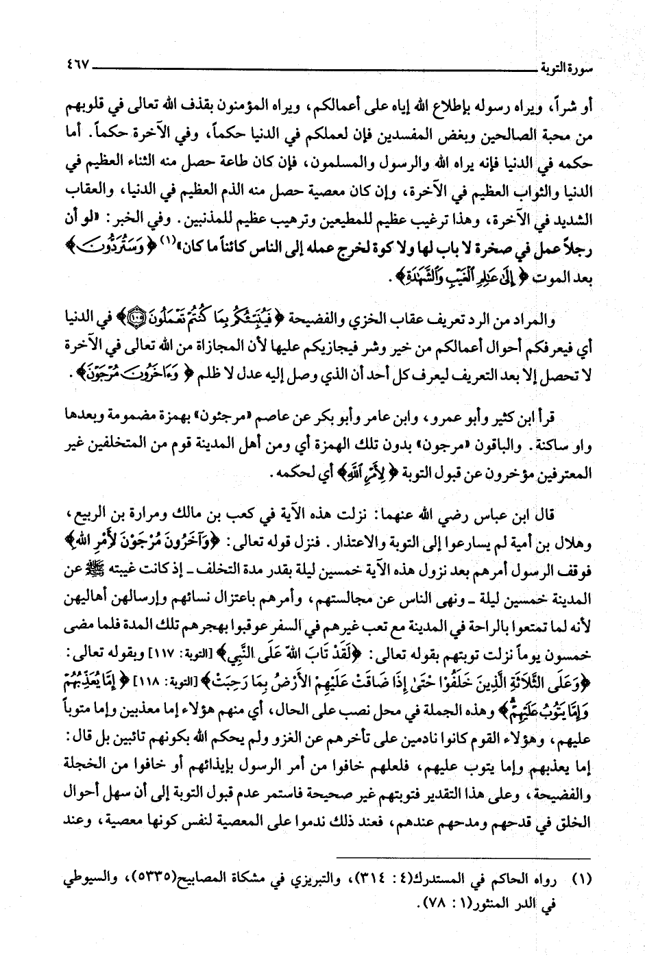 والمراد من الرد تعريف عقاب الخزي والفضيحة فَيُنَبِّئُكُمْ بِما كُنْتُمْ تَعْمَلُونَ (105) في الدنيا أي فيعرفكم أحوال أعمالكم من خير وشر فيجازيكم عليها لأن المجازاة من الله تعالى في الآخرة لا تحصل إلا بعد التعريف ليعرف كل أحد أن الذي وصل إليه عدل لا ظلم وَآخَرُونَ مُرْجَوْنَ.