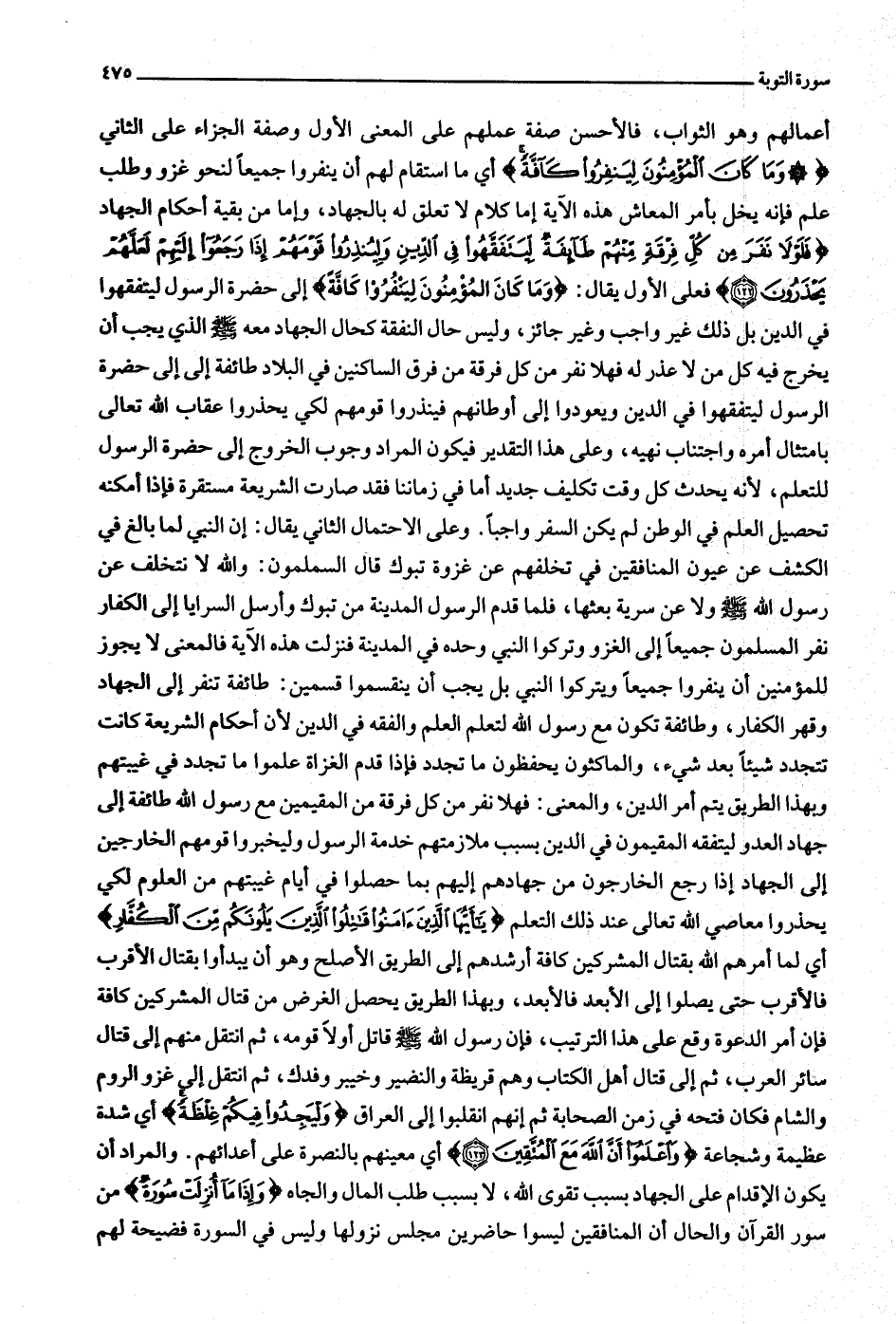 أعمالهم وهو الثواب، فالأحسن صفة عملهم على المعنى الأول وصفة الجزاء على الثاني وَما كانَ الْمُؤْمِنُونَ لِيَنْفِرُوا كَافَّةً أي ما استقام لهم أن ينفروا جميعا لنحو غزو وطلب علم فإنه يخل بأمر المعاش هذه الآية إما كلام لا تعلق له بالجهاد، وإما من بقية أحكام الجهاد فَلَوْلا نَفَرَ مِنْ كُلِّ فِرْقَةٍ مِنْهُمْ طائِفَةٌ لِيَتَفَقَّهُوا فِي الدِّينِ وَلِيُنْذِرُوا قَوْمَهُمْ إِذا رَجَعُوا إِلَيْهِمْ لَعَلَّهُمْ يَحْذَرُونَ (122) فعلى الأول يقال: وَما كانَ الْمُؤْمِنُونَ لِيَنْفِرُوا كَافَّةً إلى حضرة الرسول ليتفقهوا في الدين بل ذلك غير واجب وغير جائز، وليس حال النفقة كحال الجهاد معه صلّى الله عليه وسلّم الذي يجب أن يخرج فيه كل من لا عذر له فهلا نفر من كل فرقة من فرق الساكنين في البلاد طائفة إلى إلى حضرة الرسول ليتفقهوا في الدين ويعودوا إلى أوطانهم فينذروا قومهم لكي يحذروا عقاب الله تعالى بامتثال أمره واجتناب نهيه، وعلى هذا التقدير فيكون المراد وجوب الخروج إلى حضرة الرسول للتعلم، لأنه يحدث كل وقت تكليف جديد أما في زماننا فقد صارت الشريعة مستقرة فإذا أمكنه تحصيل العلم في الوطن لم يكن السفر واجبا. وعلى الاحتمال الثاني يقال: إن النبي لما بالغ في الكشف عن عيون المنافقين في تخلفهم عن غزوة تبوك قال المسلمون: والله لا نتخلف عن رسول الله صلّى الله عليه وسلّم ولا عن سرية بعثها، فلما قدم الرسول المدينة من تبوك وأرسل السرايا إلى الكفار نفر المسلمون جميعا إلى الغزو وتركوا النبي وحده في المدينة فنزلت هذه الآية فالمعنى لا يجوز للمؤمنين أن ينفروا جميعا ويتركوا النبي بل يجب أن ينقسموا قسمين: طائفة تنفر إلى الجهاد وقهر الكفار، وطائفة تكون مع رسول الله لتعلم العلم والفقه في الدين لأن أحكام الشريعة كانت تتجدد شيئا بعد شيء، والماكثون يحفظون ما تجدد فإذا قدم الغزاة علموا ما تجدد في غيبتهم وبهذا الطريق يتم أمر الدين، والمعنى: فهلا نفر من كل فرقة من المقيمين مع رسول الله طائفة إلى جهاد العدو ليتفقه المقيمون في الدين بسبب ملازمتهم خدمة الرسول وليخبروا قومهم الخارجين إلى الجهاد إذا رجع الخارجون من جهادهم إليهم بما حصلوا في أيام غيبتهم من العلوم لكي يحذروا معاصي الله تعالى عند ذلك التعلم يا أَيُّهَا الَّذِينَ آمَنُوا قاتِلُوا الَّذِينَ يَلُونَكُمْ مِنَ الْكُفَّارِ أي لما أمرهم الله بقتال المشركين كافة أرشدهم إلى الطريق الأصلح وهو أن يبدءوا بقتال الأقرب فالأقرب حتى يصلوا إلى الأبعد فالأبعد، وبهذا الطريق يحصل الغرض من قتال المشركين كافة فإن أمر الدعوة وقع على هذا الترتيب، فإن رسول الله صلّى الله عليه وسلّم قاتل أولا قومه، ثم انتقل منهم إلى قتال سائر العرب، ثم إلى قتال أهل الكتاب وهم قريظة والنضير وخيبر وفدك، ثم انتقل إلى غزو الروم والشام فكان فتحه في زمن الصحابة ثم إنهم انقلبوا إلى العراق وَلْيَجِدُوا فِيكُمْ غِلْظَةً أي شدة عظيمة وشجاعة وَاعْلَمُوا أَنَّ اللَّهَ مَعَ الْمُتَّقِينَ (123) أي معينهم بالنصرة على أعدائهم. والمراد أن يكون الإقدام على الجهاد بسبب تقوى الله، لا بسبب طلب المال والجاه وَإِذا ما أُنْزِلَتْ سُورَةٌ من سور القرآن والحال أن المنافقين ليسوا حاضرين مجلس نزولها وليس في السورة فضيحة لهم