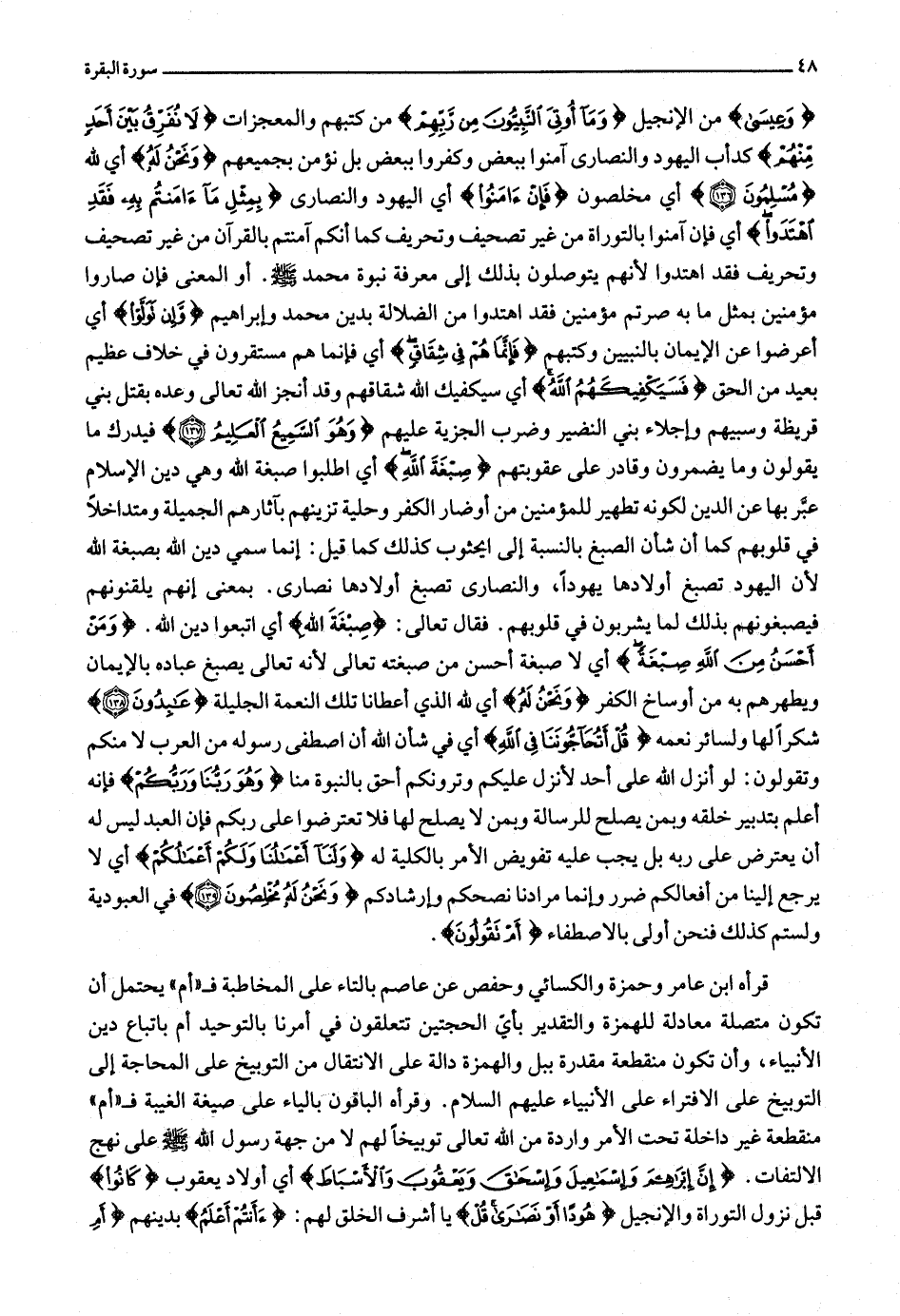وَعِيسى من الإنجيل وَما أُوتِيَ النَّبِيُّونَ مِنْ رَبِّهِمْ من كتبهم والمعجزات لا نُفَرِّقُ بَيْنَ أَحَدٍ مِنْهُمْ كدأب اليهود والنصارى آمنوا ببعض وكفروا ببعض بل نؤمن بجميعهم وَنَحْنُ لَهُ أي لله مُسْلِمُونَ (136) أي مخلصون فَإِنْ آمَنُوا أي اليهود والنصارى بِمِثْلِ ما آمَنْتُمْ بِهِ فَقَدِ اهْتَدَوْا أي فإن آمنوا بالتوراة من غير تصحيف وتحريف كما أنكم آمنتم بالقرآن من غير تصحيف وتحريف فقد اهتدوا لأنهم يتوصلون بذلك إلى معرفة نبوة محمد صلّى الله عليه وسلّم. أو المعنى فإن صاروا مؤمنين بمثل ما به صرتم مؤمنين فقد اهتدوا من الضلالة بدين محمد وإبراهيم وَإِنْ تَوَلَّوْا أي أعرضوا عن الإيمان بالنبيين وكتبهم فَإِنَّما هُمْ فِي شِقاقٍ أي فإنما هم مستقرون في خلاف عظيم بعيد من الحق فَسَيَكْفِيكَهُمُ اللَّهُ أي سيكفيك الله شقاقهم وقد أنجز الله تعالى وعده بقتل بني قريظة وسبيهم وإجلاء بني النضير وضرب الجزية عليهم وَهُوَ السَّمِيعُ الْعَلِيمُ (137) فيدرك ما يقولون وما يضمرون وقادر على عقوبتهم صِبْغَةَ اللَّهِ أي اطلبوا صبغة الله وهي دين الإسلام عبّر بها عن الدين لكونه تطهير للمؤمنين من أوضار الكفر وحلية تزينهم بآثارهم الجميلة ومتداخلا في قلوبهم كما أن شأن الصبغ بالنسبة إلى أي ثوب كذلك كما قيل: إنما سمي دين الله بصبغة الله لأن اليهود تصبغ أولادها يهودا، والنصارى تصبغ أولادها نصارى. بمعنى إنهم يلقنونهم فيصبغونهم بذلك لما يشربون في قلوبهم. فقال تعالى: صِبْغَةَ اللَّهِ أي اتبعوا دين الله. وَمَنْ أَحْسَنُ مِنَ اللَّهِ صِبْغَةً أي لا صبغة أحسن من صبغته تعالى لأنه تعالى يصبغ عباده بالإيمان ويطهرهم به من أوساخ الكفر وَنَحْنُ لَهُ أي لله الذي أعطانا تلك النعمة الجليلة عابِدُونَ (138) شكرا لها ولسائر نعمه قُلْ أَتُحَاجُّونَنا فِي اللَّهِ أي في شأن الله أن اصطفى رسوله من العرب لا منكم وتقولون: لو أنزل الله على أحد لأنزل عليكم وترونكم أحق بالنبوة منا وَهُوَ رَبُّنا وَرَبُّكُمْ فإنه أعلم بتدبير خلقه وبمن يصلح للرسالة وبمن لا يصلح لها فلا تعترضوا على ربكم فإن العبد ليس له أن يعترض على ربه بل يجب عليه تفويض الأمر بالكلية له وَلَنا أَعْمالُنا وَلَكُمْ أَعْمالُكُمْ أي لا يرجع إلينا من أفعالكم ضرر وإنما مرادنا نصحكم وإرشادكم وَنَحْنُ لَهُ مُخْلِصُونَ (139) في العبودية ولستم كذلك فنحن أولى بالاصطفاء أَمْ تَقُولُونَ.