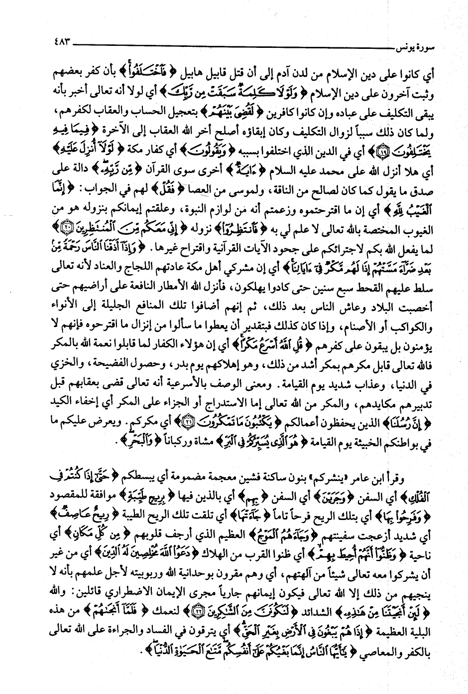 وقرأ ابن عامر «ينشركم» بنون ساكنة فشين معجمة مضمومة أي يبسطكم حَتَّى إِذا كُنْتُمْ فِي الْفُلْكِ أي السفن وَجَرَيْنَ أي السفن بِهِمْ أي بالذين فيها بِرِيحٍ طَيِّبَةٍ موافقة للمقصود وَفَرِحُوا بِها أي بتلك الريح فرحا تاما جاءَتْها أي تلقت تلك الريح الطيبة رِيحٌ عاصِفٌ أي شديد أزعجت سفينتهم وَجاءَهُمُ الْمَوْجُ العظيم الذي أرجف قلوبهم مِنْ كُلِّ مَكانٍ أي ناحية وَظَنُّوا أَنَّهُمْ أُحِيطَ بِهِمْ أي ظنوا القرب من الهلاك دَعَوُا اللَّهَ مُخْلِصِينَ لَهُ الدِّينَ أي من غير أن يشركوا معه تعالى شيئا من آلهتهم، أي وهم مقرون بوحدانية الله وربوبيته لأجل علمهم بأنه لا ينجيهم من ذلك إلا الله تعالى فيكون إيمانهم جاريا مجرى الإيمان الاضطراري قائلين: والله لَئِنْ أَنْجَيْتَنا مِنْ هذِهِ الشدائد لَنَكُونَنَّ مِنَ الشَّاكِرِينَ (22) لنعمك فَلَمَّا أَنْجاهُمْ من هذه البلية العظيمة إِذا هُمْ يَبْغُونَ فِي الْأَرْضِ بِغَيْرِ الْحَقِّ أي يترقون في الفساد والجراءة على الله تعالى بالكفر والمعاصي يا أَيُّهَا النَّاسُ إِنَّما بَغْيُكُمْ عَلى أَنْفُسِكُمْ مَتاعَ الْحَياةِ الدُّنْيا.