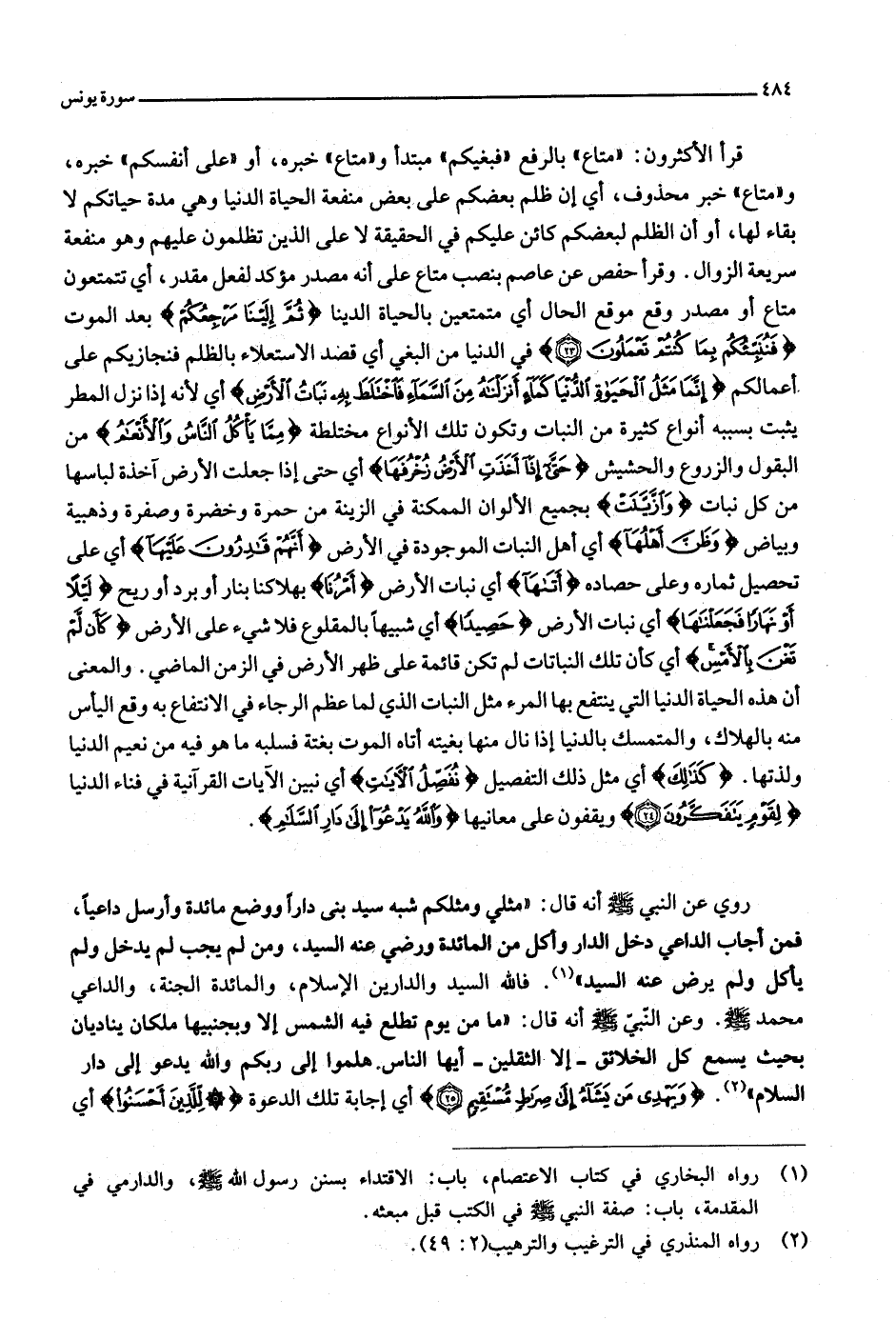 من البغي أي قصد الاستعلاء بالظلم فنجازيكم على أعمالكم إِنَّما مَثَلُ الْحَياةِ الدُّنْيا كَماءٍ أَنْزَلْناهُ مِنَ السَّماءِ فَاخْتَلَطَ بِهِ نَباتُ الْأَرْضِ أي لأنه إذا نزل المطر يثبت بسببه أنواع كثيرة من النبات وتكون تلك الأنواع مختلطة مِمَّا يَأْكُلُ النَّاسُ وَالْأَنْعامُ من البقول والزروع والحشيش حَتَّى إِذا أَخَذَتِ الْأَرْضُ زُخْرُفَها أي حتى إذا جعلت الأرض آخذة لباسها من كل نبات وَازَّيَّنَتْ بجميع الألوان الممكنة في الزينة من حمرة وخضرة وصفرة وذهبية وبياض وَظَنَّ أَهْلُها أي أهل النبات الموجودة في الأرض أَنَّهُمْ قادِرُونَ عَلَيْها أي على تحصيل ثماره وعلى حصاده أَتاها أي نبات الأرض أَمْرُنا بهلاكنا بنار أو برد أو ريح لَيْلًا أَوْ نَهاراً فَجَعَلْناها أي نبات الأرض حَصِيداً أي شبيها بالمقلوع فلا شيء على الأرض كَأَنْ لَمْ تَغْنَ بِالْأَمْسِ أي كأن تلك النباتات لم تكن قائمة على ظهر الأرض في الزمن الماضي. والمعنى أن هذه الحياة الدنيا التي ينتفع بها المرء مثل النبات الذي لما عظم الرجاء في الانتفاع به وقع اليأس منه بالهلاك، والمتمسك بالدنيا إذا نال منها بغيته أتاه الموت بغتة فسلبه ما هو فيه من نعيم الدنيا ولذتها. كَذلِكَ أي مثل ذلك التفصيل نُفَصِّلُ الْآياتِ أي نبين الآيات القرآنية في فناء الدنيا لِقَوْمٍ يَتَفَكَّرُونَ (24) ويقفون على معانيها وَاللَّهُ يَدْعُوا إِلى دارِ السَّلامِ.