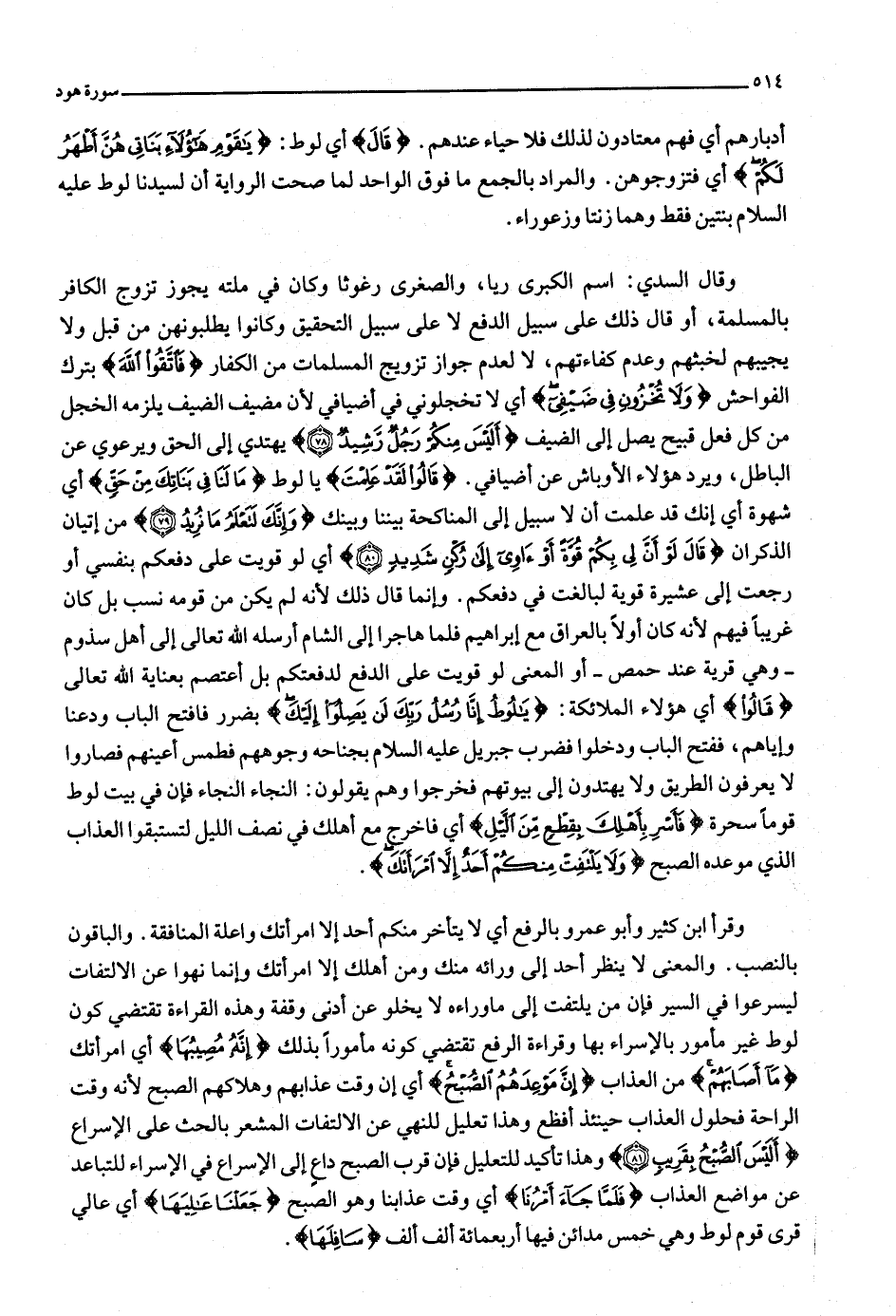 وقرأ ابن كثير وأبو عمرو بالرفع أي لا يتأخر منكم أحد إلا امرأتك واعلة المنافقة. والباقون بالنصب. والمعنى لا ينظر أحد إلى ورائه منك ومن أهلك إلا امرأتك وإنما نهوا عن الالتفات ليسرعوا في السير فإن من يلتفت إلى ما وراءه لا يخلو عن أدنى وقفة وهذه القراءة تقتضي كون لوط غير مأمور بالإسراء بها وقراءة الرفع تقتضي كونه مأمورا بذلك إِنَّهُ مُصِيبُها أي امرأتك ما أَصابَهُمْ من العذاب إِنَّ مَوْعِدَهُمُ الصُّبْحُ أي إن وقت عذابهم وهلاكهم الصبح لأنه وقت الراحة فحلول العذاب حينئذ أفظع وهذا تعليل للنهي عن الالتفات المشعر بالحث على الإسراع أَلَيْسَ الصُّبْحُ بِقَرِيبٍ (81) وهذا تأكيد للتعليل فإن قرب الصبح داع إلى الإسراع في الإسراء للتباعد عن مواضع العذاب فَلَمَّا جاءَ أَمْرُنا أي وقت عذابنا وهو الصبح جَعَلْنا عالِيَها أي عالي قرى قوم لوط وهي خمس مدائن فيها أربعمائة ألف ألف سافِلَها.