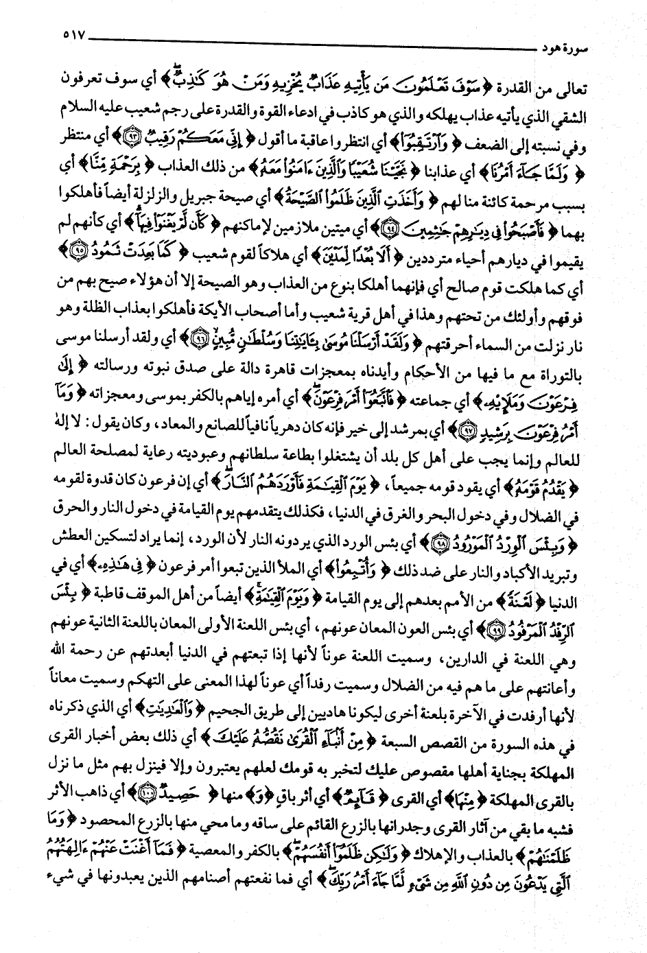 تعالى من القدرة سَوْفَ تَعْلَمُونَ مَنْ يَأْتِيهِ عَذابٌ يُخْزِيهِ وَمَنْ هُوَ كاذِبٌ أي سوف تعرفون الشقي الذي يأتيه عذاب يهلكه والذي هو كاذب في ادعاء القوة والقدرة على رجم شعيب عليه السلام وفي نسبته إلى الضعف وَارْتَقِبُوا أي انتظروا عاقبة ما أقول إِنِّي مَعَكُمْ رَقِيبٌ (93) أي منتظر وَلَمَّا جاءَ أَمْرُنا أي عذابنا نَجَّيْنا شُعَيْباً وَالَّذِينَ آمَنُوا مَعَهُ من ذلك العذاب بِرَحْمَةٍ مِنَّا أي بسبب مرحمة كائنة منا لهم وَأَخَذَتِ الَّذِينَ ظَلَمُوا الصَّيْحَةُ أي صيحة جبريل والزلزلة أيضا فأهلكوا بهما فَأَصْبَحُوا فِي دِيارِهِمْ جاثِمِينَ (94) أي ميتين ملازمين لأماكنهم كَأَنْ لَمْ يَغْنَوْا فِيها أي كأنهم لم يقيموا في ديارهم أحياء مترددين أَلا بُعْداً لِمَدْيَنَ أي هلاكا لقوم شعيب كَما بَعِدَتْ ثَمُودُ (95) أي كما هلكت قوم صالح أي فإنهما أهلكا بنوع من العذاب وهو الصيحة إلا أن هؤلاء صيح بهم من فوقهم وأولئك من تحتهم وهذا في أهل قرية شعيب وأما أصحاب الأيكة فأهلكوا بعذاب الظلة وهو نار نزلت من السماء أحرقتهم وَلَقَدْ أَرْسَلْنا مُوسى بِآياتِنا وَسُلْطانٍ مُبِينٍ (96) أي ولقد أرسلنا موسى بالتوراة مع ما فيها من الأحكام وأيدناه بمعجزات قاهرة دالة على صدق نبوته ورسالته إِلى فِرْعَوْنَ وَمَلَائِهِ أي جماعته فَاتَّبَعُوا أَمْرَ فِرْعَوْنَ أي أمره إياهم بالكفر بموسى ومعجزاته وَما أَمْرُ فِرْعَوْنَ بِرَشِيدٍ (97) أي بمرشد إلى خير فإنه كان دهريا نافيا للصانع والمعاد، وكان يقول: لا إله للعالم وإنما يجب على أهل كل بلد أن يشتغلوا بطاعة سلطانهم وعبوديته رعاية لمصلحة العالم يَقْدُمُ قَوْمَهُ أي يقود قومه جميعا، يَوْمَ الْقِيامَةِ فَأَوْرَدَهُمُ النَّارَ أي إن فرعون كان قدوة لقومه في الضلال وفي دخول البحر والغرق في الدنيا، فكذلك يتقدمهم يوم القيامة في دخول النار والحرق وَبِئْسَ الْوِرْدُ الْمَوْرُودُ (98) أي بئس الورد الذي يردونه النار لأن الورد، إنما يراد لتسكين العطش وتبريد الأكباد والنار على ضد ذلك وَأُتْبِعُوا أي الملأ الذين تبعوا أمر فرعون فِي هذِهِ أي في الدنيا لَعْنَةً من الأمم بعدهم إلى يوم القيامة وَيَوْمَ الْقِيامَةِ أيضا من أهل الموقف قاطبة بِئْسَ الرِّفْدُ الْمَرْفُودُ (99) أي بئس العون المعان عونهم، أي بئس اللعنة الأولى المعان باللعنة الثانية عونهم وهي اللعنة في الدارين، وسميت اللعنة عونا لأنها إذا تبعتهم في الدنيا أبعدتهم عن رحمة الله وأعانتهم على ما هم فيه من الضلال وسميت رفدا أي عونا لهذا المعنى على التهكم وسميت معانا لأنها أرفدت في الآخرة بلعنة أخرى ليكونا هاديين إلى طريق الجحيم وَالْعادِياتِ أي الذي ذكرناه في هذه السورة من القصص السبعة مِنْ أَنْباءِ الْقُرى نَقُصُّهُ عَلَيْكَ أي ذلك بعض أخبار القرى المهلكة بجناية أهلها مقصوص عليك لتخبر به قومك لعلهم يعتبرون وإلا فينزل بهم مثل ما نزل بالقرى المهلكة مِنْها أي القرى قائِمٌ أي أثر باق وَمنها حَصِيدٌ (100) أي ذاهب الأثر فشبه ما بقي من آثار القرى وجدرانها بالزرع القائم على ساقه وما محي منها بالزرع المحصود