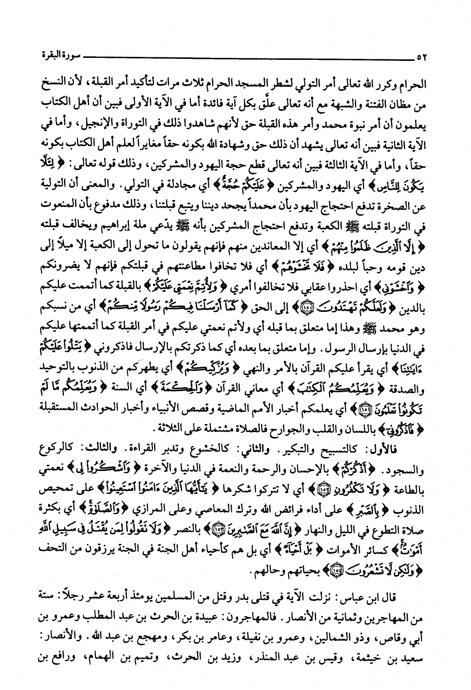 الحرام وكرر الله تعالى أمر التولي لشطر المسجد الحرام ثلاث مرات لتأكيد أمر القبلة، لأن النسخ من مظان الفتنة والشبهة مع أنه تعالى علّق بكل آية فائدة أما في الآية الأولى فبين أن أهل الكتاب يعلمون أن أمر نبوة محمد وأمر هذه القبلة حق لأنهم شاهدوا ذلك في التوراة والإنجيل، وأما في الآية الثانية فبين أنه تعالى يشهد أن ذلك حق وشهادة الله بكونه حقا مغايرا لعلم أهل الكتاب بكونه حقا، وأما في الآية الثالثة فبين أنه تعالى قطع حجة اليهود والمشركين، وذلك قوله تعالى: لِئَلَّا يَكُونَ لِلنَّاسِ أي اليهود والمشركين عَلَيْكُمْ حُجَّةٌ أي مجادلة في التولي. والمعنى أن التولية عن الصخرة تدفع احتجاج اليهود بأن محمدا يجحد ديننا ويتبع قبلتنا، وذلك مدفوع بأن المنعوت في التوراة قبلته صلّى الله عليه وسلّم الكعبة وتدفع احتجاج المشركين بأنه صلّى الله عليه وسلّم يدّعي ملة إبراهيم ويخالف قبلته إِلَّا الَّذِينَ ظَلَمُوا مِنْهُمْ أي إلا المعاندين منهم فإنهم يقولون ما تحول إلى الكعبة إلا ميلا إلى دين قومه وحبا لبلده فَلا تَخْشَوْهُمْ أي فلا تخافوا مطاعنتهم في قبلتكم فإنهم لا يضرونكم وَاخْشَوْنِي أي احذروا عقابي فلا تخالفوا أمري وَلِأُتِمَّ نِعْمَتِي عَلَيْكُمْ بالقبلة كما أتممت عليكم بالدين وَلَعَلَّكُمْ تَهْتَدُونَ (150) إلى الحق