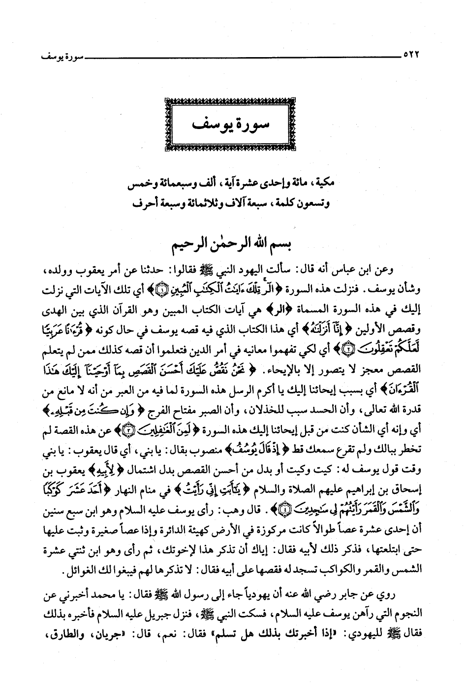 وعن ابن عباس أنه قال: سألت اليهود النبي صلّى الله عليه وسلّم فقالوا: حدثنا عن أمر يعقوب وولده، وشأن يوسف. فنزلت هذه السورة الر تِلْكَ آياتُ الْكِتابِ الْمُبِينِ (1) أي تلك الآيات التي نزلت إليك في هذه السورة المسماة الر هي آيات الكتاب المبين وهو القرآن الذي بين الهدى وقصص الأولين إِنَّا أَنْزَلْناهُ أي هذا الكتاب الذي فيه قصه يوسف في حال كونه قُرْآناً عَرَبِيًّا لَعَلَّكُمْ تَعْقِلُونَ (2) أي لكي تفهموا معانيه في أمر الدين فتعلموا أن قصه كذلك ممن لم يتعلم القصص معجز لا يتصور إلا بالإيحاء. نَحْنُ نَقُصُّ عَلَيْكَ أَحْسَنَ الْقَصَصِ بِما أَوْحَيْنا إِلَيْكَ هذَا الْقُرْآنَ أي بسبب إيحائنا إليك يا أكرم الرسل هذه السورة لما فيه من العبر من أنه لا مانع من قدرة الله تعالى، وأن الحسد سبب للخذلان، وأن الصبر مفتاح الفرج وَإِنْ كُنْتَ مِنْ قَبْلِهِ أي وإنه أي الشأن كنت من قبل إيحائنا إليك هذه السورة لَمِنَ الْغافِلِينَ (3) عن هذه القصة لم تخطر ببالك ولم تقرع سمعك قط إِذْ قالَ يُوسُفُ منصوب بقال: يا بني، أي قال يعقوب: يا بني وقت قول يوسف له: كيت وكيت أو بدل من أحسن القصص بدل اشتمال لِأَبِيهِ يعقوب بن إسحاق بن إبراهيم عليهم الصلاة والسلام يا أَبَتِ إِنِّي رَأَيْتُ في منام النهار أَحَدَ عَشَرَ كَوْكَباً وَالشَّمْسَ وَالْقَمَرَ رَأَيْتُهُمْ لِي ساجِدِينَ (4) . قال وهب: رأى يوسف