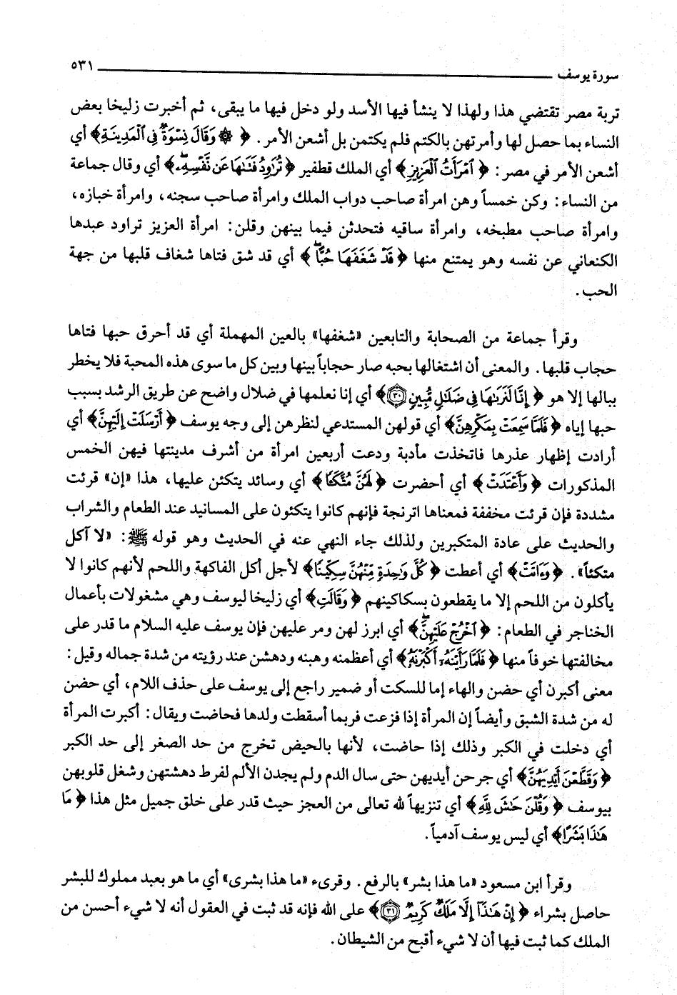 تربة مصر تقتضي هذا ولهذا لا ينشأ فيها الأسد ولو دخل فيها ما يبقى، ثم أخبرت زليخا بعض النساء بما حصل لها وأمرتهن بالكتم فلم يكتمن بل أشعن الأمر. وَقالَ نِسْوَةٌ فِي الْمَدِينَةِ أي أشعن الأمر في مصر: امْرَأَتُ الْعَزِيزِ أي الملك قطفير تُراوِدُ فَتاها عَنْ نَفْسِهِ أي وقال جماعة من النساء: وكن خمسا وهن امرأة صاحب دواب الملك وامرأة صاحب سجنه، وامرأة خبازه، وامرأة صاحب مطبخه، وامرأة ساقيه فتحدثن فيما بينهن وقلن: امرأة العزيز تراود عبدها الكنعاني عن نفسه وهو يمتنع منها قَدْ شَغَفَها حُبًّا أي قد شق فتاها شغاف قلبها من جهة الحب.