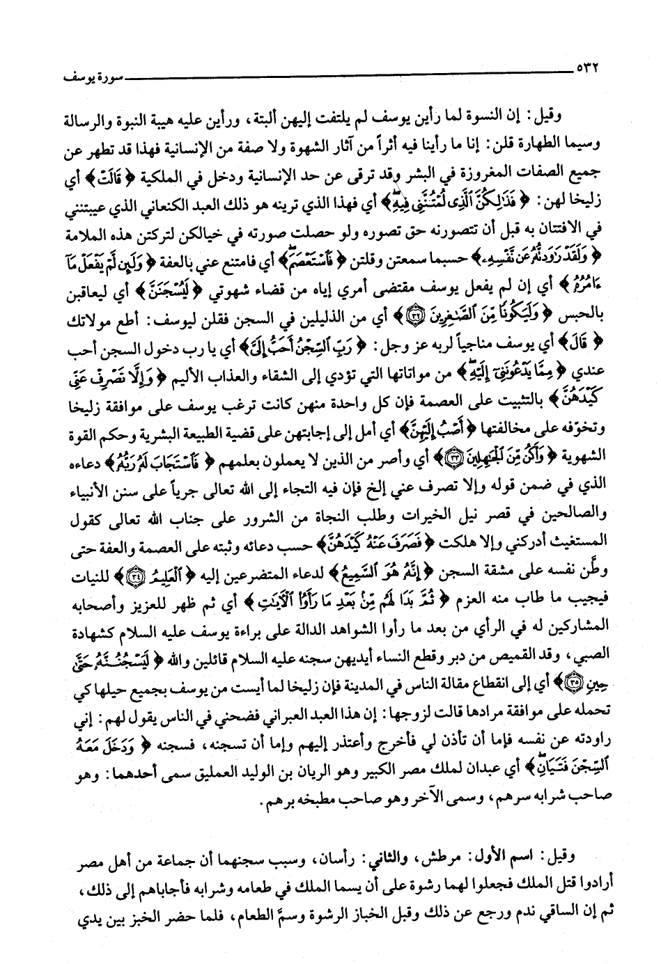 وقيل: إن النسوة لما رأين يوسف لم يلتفت إليهن ألبتة، ورأين عليه هيبة النبوة والرسالة وسيما الطهارة قلن: إنا ما رأينا فيه أثرا من آثار الشهوة ولا صفة من الإنسانية فهذا قد تطهر عن جميع الصفات المغروزة في البشر وقد ترقى عن حد الإنسانية ودخل في الملكية قالَتْ أي زليخا لهن: فَذلِكُنَّ الَّذِي لُمْتُنَّنِي فِيهِ أي فهذا الذي ترينه هو ذلك العبد الكنعاني الذي عيبتنني في الافتتان به قبل أن تتصورنه حق تصوره ولو حصلت صورته في خيالكن لتركتن هذه الملامة وَلَقَدْ راوَدْتُهُ عَنْ نَفْسِهِ حسبما سمعتن وقلتن فَاسْتَعْصَمَ أي فامتنع عني بالعفة وَلَئِنْ لَمْ يَفْعَلْ ما آمُرُهُ أي إن لم يفعل يوسف مقتضى أمري إياه من قضاء شهوتي لَيُسْجَنَنَّ أي ليعاقبن بالحبس وَلَيَكُوناً مِنَ الصَّاغِرِينَ (32) أي من الذليلين في السجن فقلن ليوسف: أطع مولاتك قالَ أي يوسف مناجيا لربه عز وجل: رَبِّ السِّجْنُ أَحَبُّ إِلَيَّ أي يا رب دخول السجن أحب عندي مِمَّا يَدْعُونَنِي إِلَيْهِ من مواتاتها التي تؤدي إلى الشقاء والعذاب الأليم وَإِلَّا تَصْرِفْ عَنِّي كَيْدَهُنَّ بالتثبيت على العصمة فإن كل واحدة منهن كانت ترغب يوسف على موافقة زليخا وتخوّفه على مخالفتها أَصْبُ إِلَيْهِنَّ أي أمل إلى إجابتهن على قضية الطبيعة البشرية وحكم القوة الشهوية وَأَكُنْ مِنَ الْجاهِلِينَ (33) أي وأصر من الذين لا يعملون بعلمهم فَاسْتَجابَ لَهُ رَبُّهُ دعاءه الذي في ضمن قوله وإلا تصرف عني إلخ فإن فيه التجاء إلى الله تعالى جريا على سنن الأنبياء والصالحين في قصر نيل الخيرات وطلب النجاة من الشرور على جناب الله تعالى كقول المستغيث أدركني وإلا هلكت فَصَرَفَ عَنْهُ كَيْدَهُنَّ حسب دعائه وثبته على العصمة والعفة حتى وطّن نفسه على مشقة السجن إِنَّهُ هُوَ السَّمِيعُ لدعاء المتضرعين إليه الْعَلِيمُ (34) للنيات فيجيب ما طاب منه العزم ثُمَّ بَدا لَهُمْ مِنْ بَعْدِ ما رَأَوُا الْآياتِ أي ثم ظهر للعزيز وأصحابه المشاركين له في الرأي من بعد ما رأوا الشواهد الدالة على براءة يوسف عليه السلام كشهادة الصبي، وقد القميص من دبر وقطع النساء أيديهن سجنه عليه السلام قائلين والله لَيَسْجُنُنَّهُ حَتَّى حِينٍ (35) أي إلى انقطاع مقالة الناس في المدينة فإن زليخا لما أيست من يوسف بجميع حيلها كي تحمله على موافقة مرادها قالت لزوجها: إن هذا العبد العبراني فضحني في الناس يقول لهم: إني راودته عن نفسه فإما أن تأذن لي فأخرج وأعتذر إليهم وإما أن تسجنه، فسجنه وَدَخَلَ مَعَهُ السِّجْنَ فَتَيانِ أي عبدان لملك مصر الكبير وهو الريان بن الوليد العمليق سمى أحدهما: وهو صاحب شرابه سرهم، وسمى الآخر وهو صاحب مطبخه برهم.