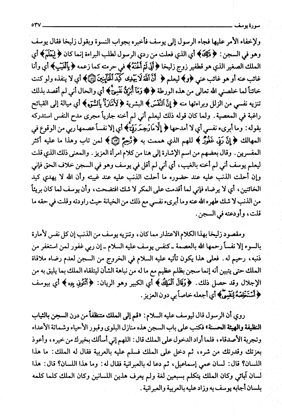 ولإخفاء الأمر عليها فجاء الرسول إلى يوسف فأخبره بجواب النسوة وبقول زليخا فقال يوسف وهو في السجن: ذلِكَ أي الذي فعلت من ردي الرسول لطلب البراءة إنما كان لِيَعْلَمَ أي الملك الصغير الذي هو قطفير زوج زليخا أَنِّي لَمْ أَخُنْهُ في حرمته كما زعمه بِالْغَيْبِ أي وأنا غائب عنه أو هو غائب عني وَليعلم أَنَّ اللَّهَ لا يَهْدِي كَيْدَ الْخائِنِينَ (52) أي لا ينفذه ولو كنت خائنا لما خلصني الله تعالى من هذه الورطة وَما أُبَرِّئُ نَفْسِي أي والحال أني لم أقصد بذلك تنزيه نفسي من الزلل وبراءتها منه إِنَّ النَّفْسَ البشرية لَأَمَّارَةٌ بِالسُّوءِ أي ميالة إلى القبائح راغبة في المعصية. ولما كان قوله ذلك ليعلم أني لم أخنه جاريا مجرى مدح النفس استدركه بقوله: وما أبرئ نفسي أي لا أمدحها إِلَّا ما رَحِمَ رَبِّي أي إلا نفسا عصمها ربي من الوقوع في المهالك إِنَّ رَبِّي غَفُورٌ للهم الذي هممت به رَحِيمٌ (53) لمن تاب وهذا ما عليه أكثر المفسرين. وقال بعضهم من اسم الإشارة إلى هنا من كلام امرأة العزيز. والمعنى ذلك الذي قلت ليعلم يوسف أني لم أخنه بالغيب، أي أني لم أقل في يوسف وهو في السجن خلاف الحق فإني وإن أحلت الذنب عليه عند حضوره ما أحلت الذنب عليه عند غيبته وأن الله لا يهدي كيد الخائنين، أي لا يرضاه فإني لما أقدمت على المكر لا شك افتضحت، وأن يوسف لما كان بريئا من الذنب لا شك طهره الله عنه وما أبرئ نفسي مع ذلك من الخيانة حيث راودته وقلت في حقه ما قلت، وأودعته في السجن.