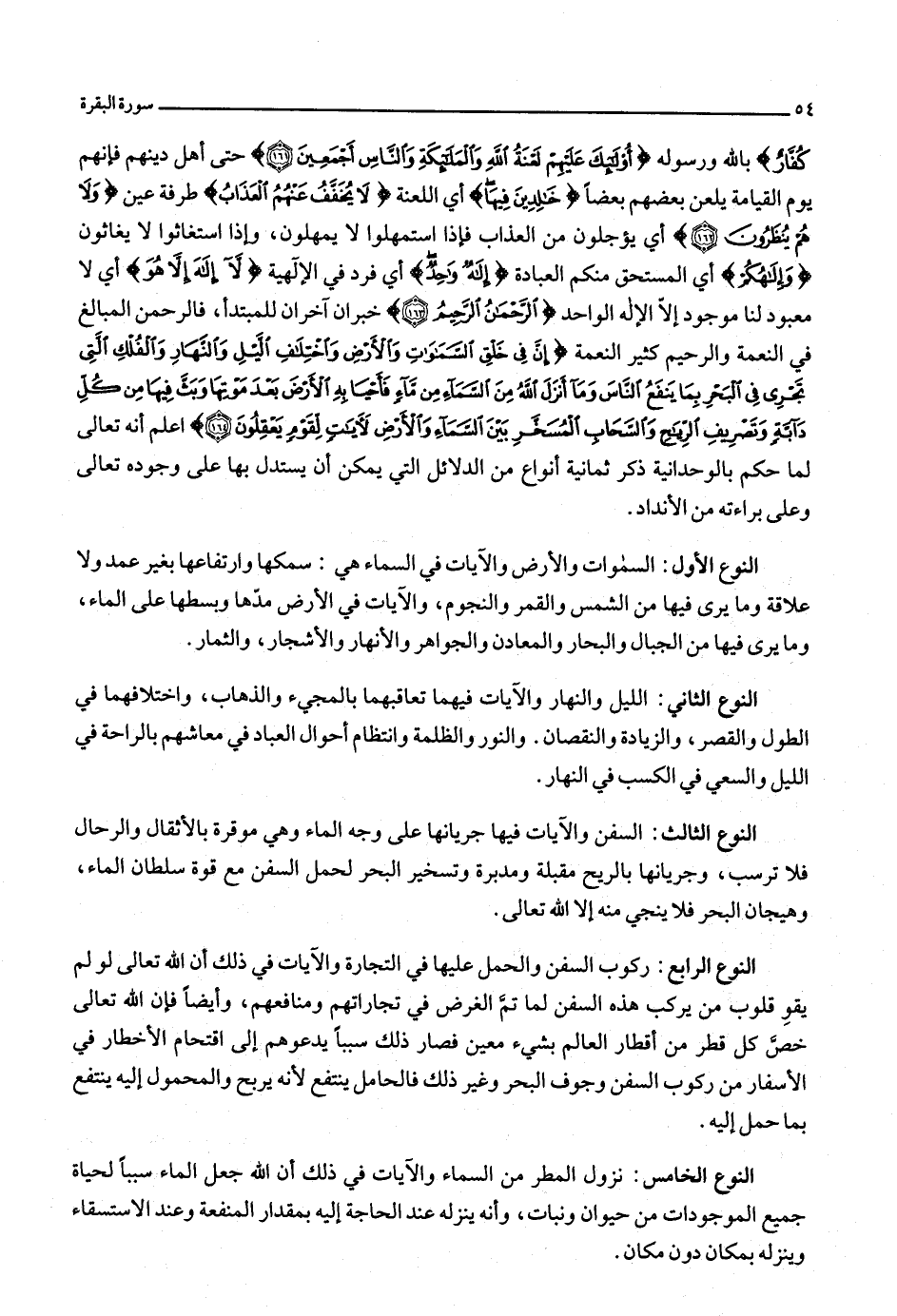 بالله ورسوله أُولئِكَ عَلَيْهِمْ لَعْنَةُ اللَّهِ وَالْمَلائِكَةِ وَالنَّاسِ أَجْمَعِينَ (161) حتى أهل دينهم فإنهم يوم القيامة يلعن بعضهم بعضا خالِدِينَ فِيها أي اللعنة لا يُخَفَّفُ عَنْهُمُ الْعَذابُ طرفة عين وَلا هُمْ يُنْظَرُونَ (162) أي يؤجلون من العذاب فإذا استمهلوا لا يمهلون، وإذا استغاثوا لا يغاثون وَإِلهُكُمْ أي المستحق منكم العبادة إِلهٌ واحِدٌ أي فرد في الإلهية لا إِلهَ إِلَّا هُوَ أي لا معبود لنا موجود إلّا الإله الواحد الرَّحْمنُ الرَّحِيمُ (163) خبران آخران للمبتدأ، فالرحمن المبالغ في النعمة والرحيم كثير النعمة إِنَّ فِي خَلْقِ السَّماواتِ وَالْأَرْضِ وَاخْتِلافِ اللَّيْلِ وَالنَّهارِ وَالْفُلْكِ الَّتِي تَجْرِي فِي الْبَحْرِ بِما يَنْفَعُ النَّاسَ وَما أَنْزَلَ اللَّهُ مِنَ السَّماءِ مِنْ ماءٍ فَأَحْيا بِهِ الْأَرْضَ بَعْدَ مَوْتِها وَبَثَّ فِيها مِنْ كُلِّ دَابَّةٍ وَتَصْرِيفِ الرِّياحِ وَالسَّحابِ الْمُسَخَّرِ بَيْنَ السَّماءِ وَالْأَرْضِ لَآياتٍ لِقَوْمٍ يَعْقِلُونَ (164) اعلم أنه تعالى لما حكم بالوحدانية ذكر ثمانية أنواع من الدلائل التي يمكن أن يستدل بها على وجوده تعالى وعلى براءته من الأنداد.