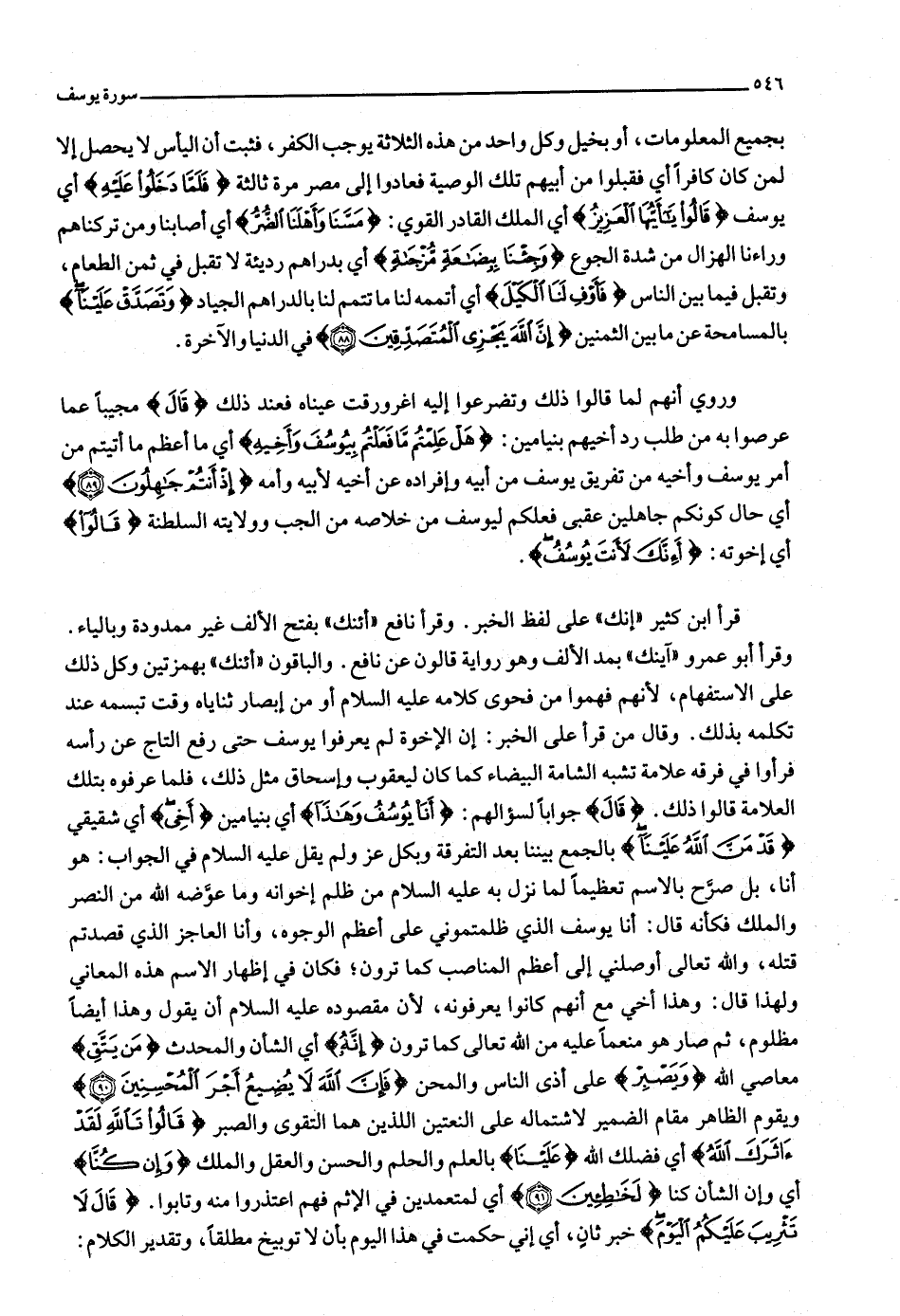 كان ليعقوب وإسحاق مثل ذلك، فلما عرفوه بتلك العلامة قالوا ذلك. قالَ جوابا لسؤالهم: أَنَا يُوسُفُ وَهذا أي بنيامين أَخِي أي شقيقي قَدْ مَنَّ اللَّهُ عَلَيْنا بالجمع بيننا بعد التفرقة وبكل عز ولم يقل عليه السلام في الجواب: هو أنا، بل صرّح بالاسم تعظيما لما نزل به عليه السلام من ظلم إخوانه وما عوّضه الله من النصر والملك فكأنه قال: أنا يوسف الذي ظلمتموني على أعظم الوجوه، وأنا العاجز الذي قصدتم قتله، والله تعالى أوصلني إلى أعظم المناصب كما ترون فكان في إظهار الاسم هذه المعاني ولهذا قال: وهذا أخي مع أنهم كانوا يعرفونه، لأن مقصوده عليه السلام أن يقول وهذا أيضا مظلوم، ثم صار هو منعما عليه من الله تعالى كما ترون إِنَّهُ أي الشأن والمحدث مَنْ يَتَّقِ معاصي الله وَيَصْبِرْ على أذى الناس والمحن فَإِنَّ اللَّهَ لا يُضِيعُ أَجْرَ الْمُحْسِنِينَ (90) ويقوم الظاهر مقام الضمير لاشتماله على النعتين اللذين هما التقوى والصبر