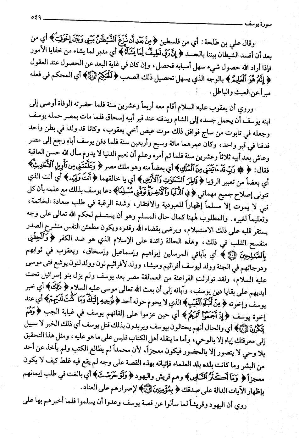 سعادة الخاتمة، وتعليما لغيره. والمطلوب هاهنا كمال حال المسلم وهو أن يستسلم لحكم الله تعالى على وجه يستقر قلبه على ذلك الاستسلام، ويرضى بقضاء الله وقدره ويكون مطمئن النفس منشرح الصدر منفسح القلب في ذلك، وهذه الحالة زائدة على الإسلام الذي هو ضد الكفر وَأَلْحِقْنِي بِالصَّالِحِينَ (101) أي بآبائي المرسلين إبراهيم وإسماعيل وإسحاق، ويعقوب في ثوابهم ودرجاتهم في الجنة وولد ليوسف أفراثيم وميشا، وولد لأفرائيم نون وولد لنون يوشع فتى موسى عليه السلام، ولقد توارثت الفراعنة من العمالقة مصر بعد يوسف ولم يزل بنو إسرائيل تحت أيديهم على بقايا دين يوسف، وآبائه إلى أن بعث الله تعالى موسى عليه السلام ذلِكَ أي خبر يوسف وإخوته مِنْ أَنْباءِ الْغَيْبِ الذي لا يحوم حوله أحد نُوحِيهِ إِلَيْكَ وَما كُنْتَ لَدَيْهِمْ أي عند إخوة يوسف إِذْ أَجْمَعُوا أَمْرَهُمْ أي حين عزموا على إلقائهم يوسف في غيابة الجب وَهُمْ يَمْكُرُونَ (102) أي والحال أنهم يحتالون بيوسف ويريدون بذلك قتل يوسف أي ذلك الخبر لا سبيل إلى معرفتك إياه إلا بالوحي، وأما ما ينقله أهل الكتاب فليس على ما هو عليه، ومثل هذا التحقيق بلا وحي لا يتصور إلا بالحضور فيكون معجزا، لأن محمدا لم يطالع الكتب ولم يأخذ عن أحد من البشر وما كانت بلده بلد العلماء فإتيانه بهذه القصة على وجه لم يقع فيه غلط كيف لا يكون معجزا وَما أَكْثَرُ النَّاسِ وهم قريش واليهود وَلَوْ حَرَصْتَ أي بالغت في طلب إيمانهم بإظهار الآيات الدالة على صدقك بِمُؤْمِنِينَ (103) لإصرارهم على العناد.