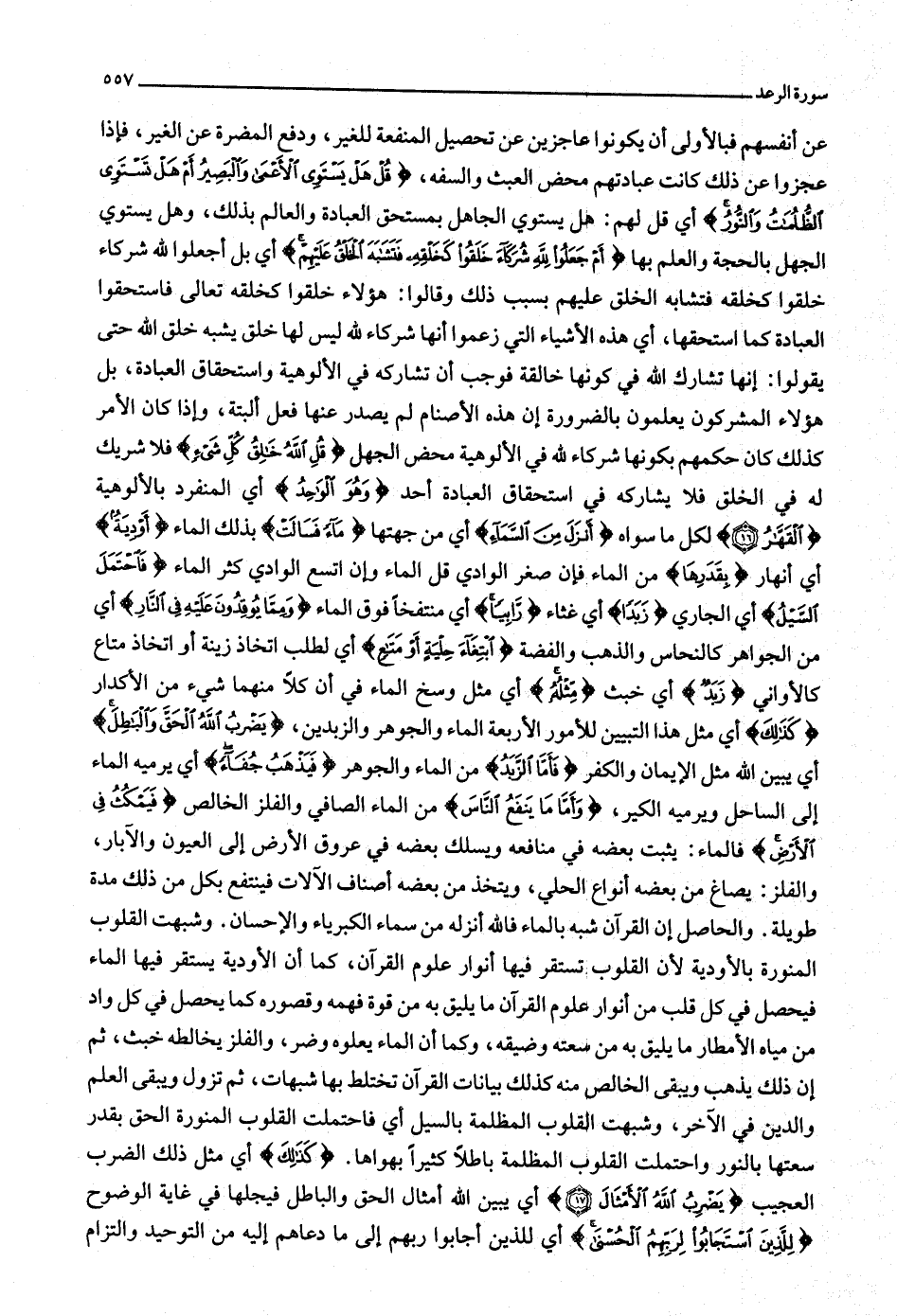 عن أنفسهم فبالأولى أن يكونوا عاجزين عن تحصيل المنفعة للغير، ودفع المضرة عن الغير، فإذا عجزوا عن ذلك كانت عبادتهم محض العبث والسفه، قُلْ هَلْ يَسْتَوِي الْأَعْمى وَالْبَصِيرُ أَمْ هَلْ تَسْتَوِي الظُّلُماتُ وَالنُّورُ أي قل لهم: هل يستوي الجاهل بمستحق العبادة والعالم بذلك، وهل يستوي الظّلمت والنّور أي قل لهم: هل يستوي الجاهل بمستحق العبادة والعالم بذلك، وهل يستوي الجهل بالحجة والعلم بها أَمْ جَعَلُوا لِلَّهِ شُرَكاءَ خَلَقُوا كَخَلْقِهِ فَتَشابَهَ الْخَلْقُ عَلَيْهِمْ أي بل أجعلوا لله شركاء خلقوا كخلقه فتشابه الخلق عليهم بسبب ذلك وقالوا: هؤلاء خلقوا كخلقه تعالى فاستحقوا العبادة كما استحقها، أي هذه الأشياء التي زعموا أنها شركاء لله ليس لها خلق يشبه خلق الله حتى يقولوا: إنها تشارك الله في كونها خالقة فوجب أن تشاركه في الألوهية واستحقاق العبادة، بل هؤلاء المشركون يعلمون بالضرورة إن هذه الأصنام لم يصدر عنها فعل ألبتة، وإذا كان الأمر كذلك كان حكمهم بكونها شركاء لله في الألوهية محض الجهل قُلِ اللَّهُ خالِقُ كُلِّ شَيْءٍ فلا شريك له في الخلق فلا يشاركه في استحقاق العبادة أحد وَهُوَ الْواحِدُ أي المنفرد بالألوهية الْقَهَّارُ (16) لكل ما سواه أَنْزَلَ مِنَ السَّماءِ أي من جهتها ماءً فَسالَتْ بذلك الماء أَوْدِيَةٌ أي أنهار بِقَدَرِها من الماء فإن صغر الوادي قل الماء وإن اتسع الوادي كثر الماء فَاحْتَمَلَ السَّيْلُ أي الجاري زَبَداً أي غثاء رابِياً أي منتفخا فوق الماء وَمِمَّا يُوقِدُونَ عَلَيْهِ فِي النَّارِ أي من الجواهر كالنحاس والذهب والفضة ابْتِغاءَ حِلْيَةٍ أَوْ مَتاعٍ أي لطلب اتخاذ زينة أو اتخاذ متاع كالأواني زَبَدٌ أي خبث مِثْلُهُ أي مثل وسخ الماء في أن كلا منهما شيء من الأكدار كَذلِكَ أي مثل هذا التبيين للأمور الأربعة الماء والجوهر والزبدين، يَضْرِبُ اللَّهُ الْحَقَّ وَالْباطِلَ أي يبين الله مثل الإيمان والكفر فَأَمَّا الزَّبَدُ من الماء والجوهر فَيَذْهَبُ جُفاءً أي يرميه الماء إلى الساحل ويرميه الكير، وَأَمَّا ما يَنْفَعُ النَّاسَ من الماء الصافي والفلز الخالص فَيَمْكُثُ فِي الْأَرْضِ فالماء: يثبت بعضه في منافعه ويسلك بعضه في عروق الأرض إلى العيون والآبار، والفلز: يصاغ من بعضه أنواع الحلي، ويتخذ من بعضه أصناف الآلات فينتفع بكل من ذلك مدة طويلة. والحاصل إن القرآن شبه بالماء فالله أنزله من سماء الكبرياء والإحسان. وشبهت القلوب المنورة بالأودية لأن القلوب تستقر فيها أنوار علوم القرآن، كما أن الأودية يستقر فيها الماء فيحصل في كل قلب من أنوار علوم القرآن ما يليق به من قوة فهمه وقصوره كما يحصل في كل واد من مياه الأمطار ما يليق به من سعته وضيقه، وكما أن الماء يعلوه وضر، والفلز يخالطه خبث، ثم إن ذلك يذهب