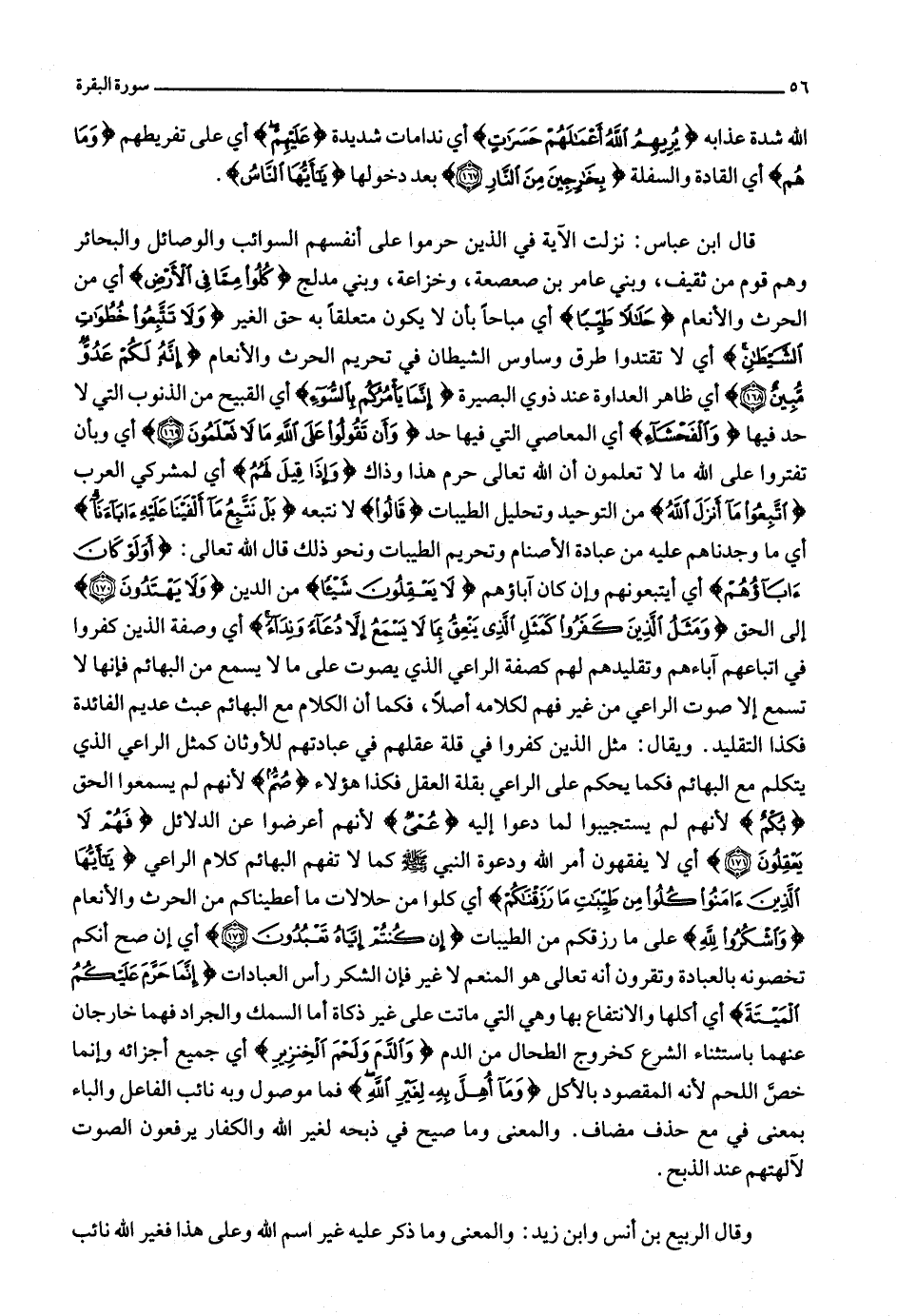 وَمَثَلُ الَّذِينَ كَفَرُوا كَمَثَلِ الَّذِي يَنْعِقُ بِما لا يَسْمَعُ إِلَّا دُعاءً وَنِداءً أي وصفة الذين كفروا في اتباعهم آباءهم وتقليدهم لهم كصفة الراعي الذي يصوت على ما لا يسمع من البهائم فإنها لا تسمع إلا صوت الراعي من غير فهم لكلامه أصلا، فكما أن الكلام مع البهائم عبث عديم الفائدة فكذا التقليد. ويقال: مثل الذين كفروا في قلة عقلهم في عبادتهم للأوثان كمثل الراعي الذي يتكلم مع البهائم فكما يحكم على الراعي بقلة العقل فكذا هؤلاء صُمٌّ لأنهم لم يسمعوا الحق بُكْمٌ لأنهم لم يستجيبوا لما دعوا إليه عُمْيٌ لأنهم أعرضوا عن الدلائل فَهُمْ لا يَعْقِلُونَ (171) أي لا يفقهون أمر الله ودعوة النبي صلّى الله عليه وسلّم كما لا تفهم البهائم كلام الراعي يا أَيُّهَا الَّذِينَ آمَنُوا كُلُوا مِنْ طَيِّباتِ ما رَزَقْناكُمْ أي كلوا من حلالات ما أعطيناكم من الحرث والأنعام وَاشْكُرُوا لِلَّهِ على ما رزقكم من الطيبات إِنْ كُنْتُمْ إِيَّاهُ تَعْبُدُونَ (172) أي إن صح أنكم تخصونه بالعبادة وتقرون أنه تعالى هو المنعم لا غير فإن الشكر رأس العبادات إِنَّما حَرَّمَ عَلَيْكُمُ الْمَيْتَةَ أي أكلها والانتفاع بها وهي التي ماتت على غير ذكاة أما السمك والجراد فهما خارجان عنهما باستثناء الشرع كخروج الطحال من الدم وَالدَّمَ وَلَحْمَ الْخِنْزِيرِ أي جميع أجزائه وإنما خصّ اللحم لأنه المقصود بالأكل وَما أُهِلَّ بِهِ لِغَيْرِ اللَّهِ فما موصول وبه نائب الفاعل والباء بمعنى في مع حذف مضاف. والمعنى وما صيح في ذبحه لغير الله والكفار يرفعون الصوت لآلهتهم عند الذبح.